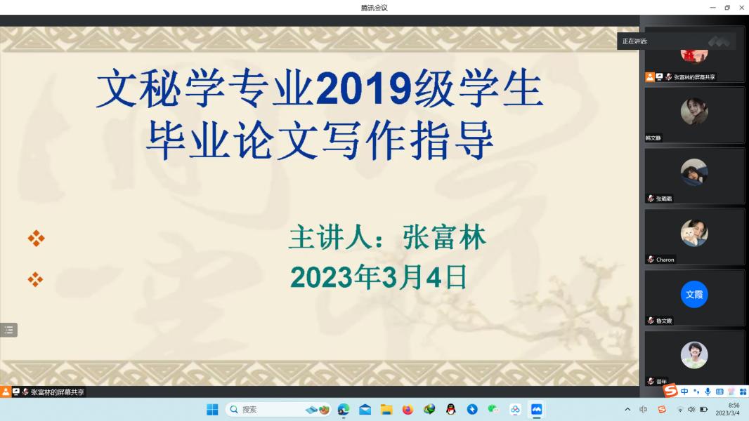 2023年3月5日,国产欧美一区二区秘书学专业举行毕业论文指导线上讲座。张富林博士为我系2019级本科毕业生毕业论文工作进行指导,秘书学2023届全体毕业生参加此次讲座。