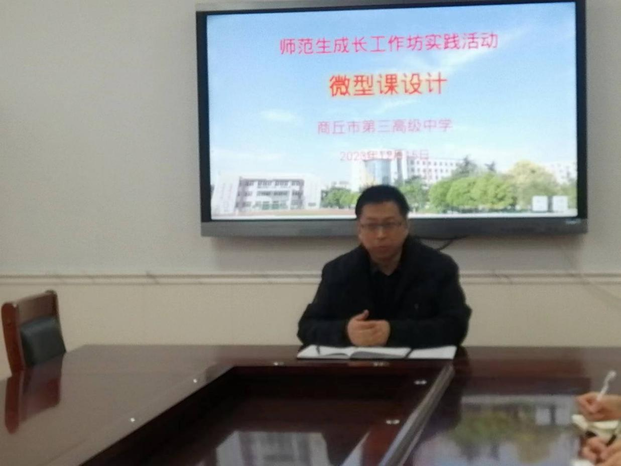 12月15号上午,中学语文师范生成长工作坊第十组坊员在商丘市第三高级中学的会议室进行了微型课设计学习。副校长张铁军与坊员们进行了充分交流。