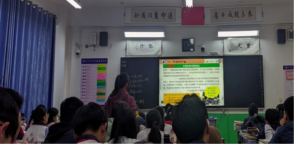 首先是观摩示范课环节。同学们先集中观摩了宋振东老师讲授的一节示范课,教学内容为高中历史选择性必修2《经济与社会生活》第十课《古代村落、集镇和城市》。这一课程是新课改后教材中新增加的内容,因此也让我们这些没有学过本课的坊员感到好奇。宋老师讲解清晰、语言流畅,通过课件演示有序地推进本课题的学习。在讲课过程中,宋老师播放视频介绍吊脚楼这一极具特色的建筑,吸引了班级学生的兴趣,并适时提出问题,学生纷纷起身,积极回答,课堂气氛轻松活跃。当下课铃声响起,一堂充实又精彩的历史课就此结束。