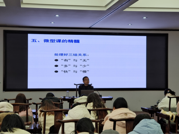 讲座伊始,高永老师向同学们介绍了微型课的定义、特点和用途,让同学们对微型课有一个初步的认识;接着,高永老师给大家着重讲解了微型课的实践。实践部分分为教案书写、课题切入、教学环节、上课情绪、板书书写、课后小结六个部分。高永老师通过生动形象的课例让同学们全面了解微型课;最后,高永老师强调了微型课的精髓以及微型课与说课、微课的区别,让同学们把握微型课的重点,学会怎样上好微型课。至此本次讲座圆满结束。