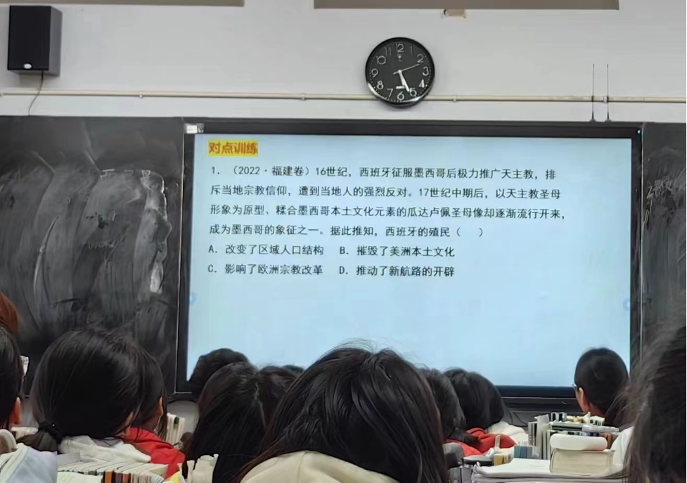 在观摩示范课之前,坊主赵华老师与坊员们一起交流了近期的学习和工作坊开展情况。接着,坊员们观摩了赵华老师的一节示范课——《近代殖民活动和人口的跨地理迁移》。在教学过程中,赵老师首先从唯物史观、时空观念、史料实证、历史解释、家国情怀五个角度展示出本节课的学习目标,通过时间轴突出重点内容和重要时间点。接着,赵老师从殖民扩张与美洲族群的变化、近代西方殖民历史中出现的人口迁移、英国的殖民开发、殖民者对大洋洲的开发、华工的迁移等方面进行了讲解。最后,通过课堂训练,让同学们对课上的知识点有了更深刻的印象。赵老师的讲解重点突出,史料丰富,在讲解过程中,善于启发学生,教学方法多样。通过观摩学习,坊员们对中学历史教学有了更清楚的认识,领悟颇多。