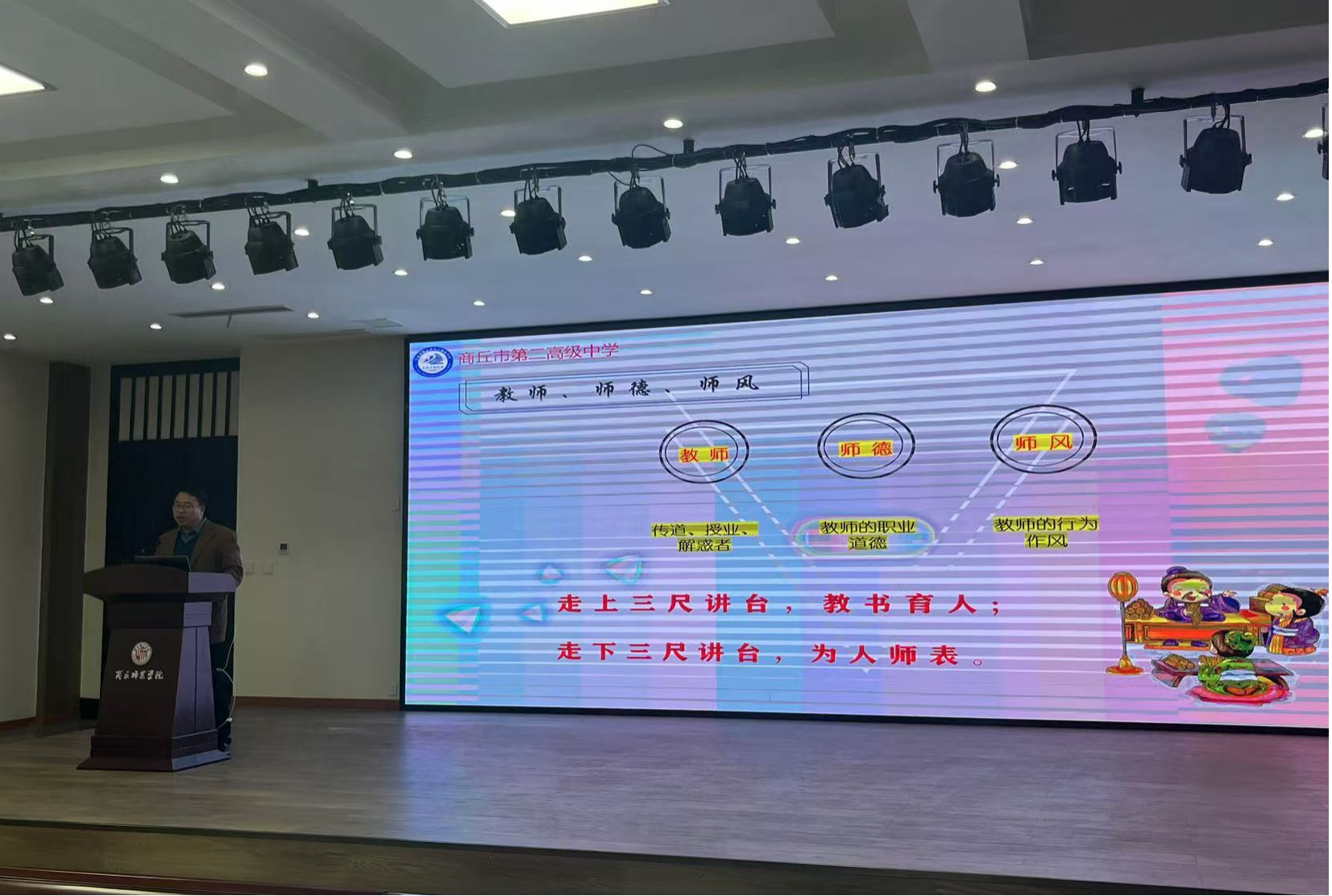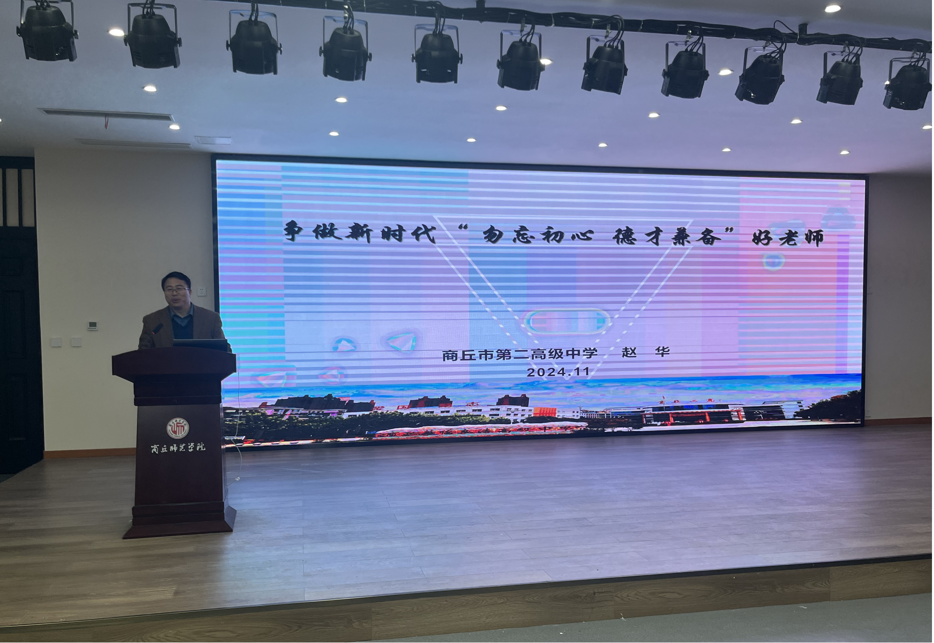 活动最后,商丘市第二高级中学的赵华老师做了《争做新时代“勿忘初心、德才兼备”好老师》的师德素养专题讲座。赵老师从新时代教师的职业、新时代对教育提出的新要求、新时代教师发展的路径选择、如何做一名好老师四个方面做了详细介绍,强调要重视师德师风,号召同学们争做新时代的“四有“好教师。