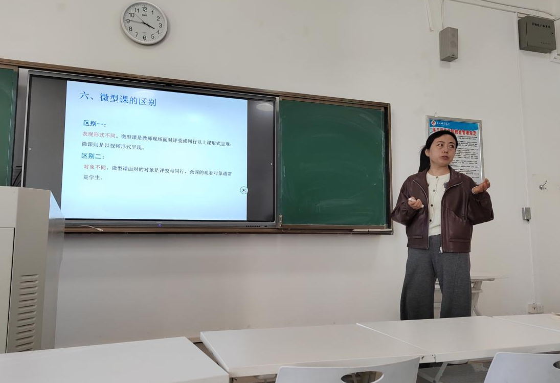 曹老师结合自身经验,从微型课的定义、特点、用途、实践、精髓及与其他课型的区别等方面展开讲解,并结合具体课例为同学们提供示范与指导。曹老师指出,微型课作为时间短、容量小、环节完整的教学形式,其特点有:短、小、精、巧;微型课十分考验讲解人的教学功底,展现教师教学设计能力与课堂掌控力,其核心在于“场上无学生,心中有学生”,通过模拟真实且完整的课堂流程体现教学实施能力;微型课教学设计需注重:导入需通过问题、情境或实例快速切入主题,各环节要在完整进行的同时避免内容冗余,把握教学时长;语言要精准简练,语速张弛有度,尤其注重上课时要情绪饱满。曹老师特别强调,微型课常见误区包括目标过多导致重点模糊、忽略学生主体地位、语速过快影响效果等,需通过精准取舍内容、模拟学生思维来规避问题;在不同课型的区别上,曹老师重点强调了微型课与微课和说课的差异,微型课重在教学实施能力的真实呈现,评委通过观察流程判断效果。