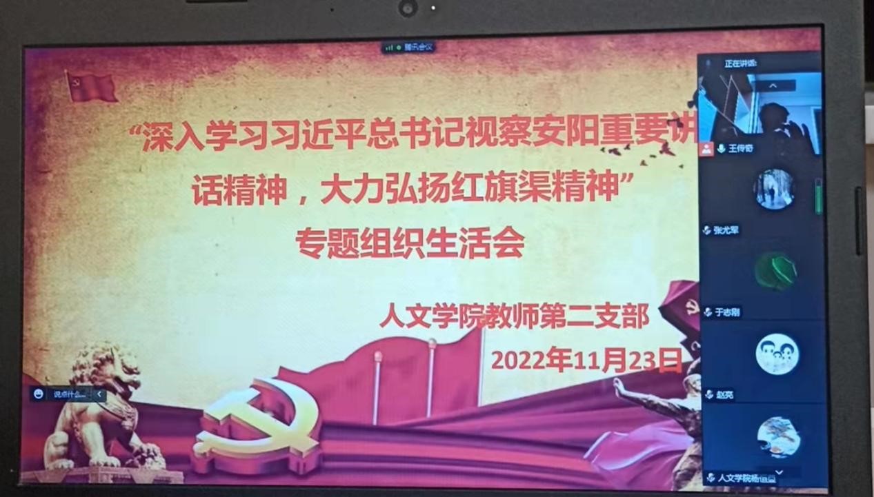 11月23日晚,按照校党委工作安排,国产欧美一区二区教师第二党支部以腾讯会议的形式召开“深入学习习近平总书记视察安阳重要讲话精神,大力弘扬红旗渠精神”专题组织生活会,会议由支部书记王传奇主持,第二支部全体党员参加了会议。