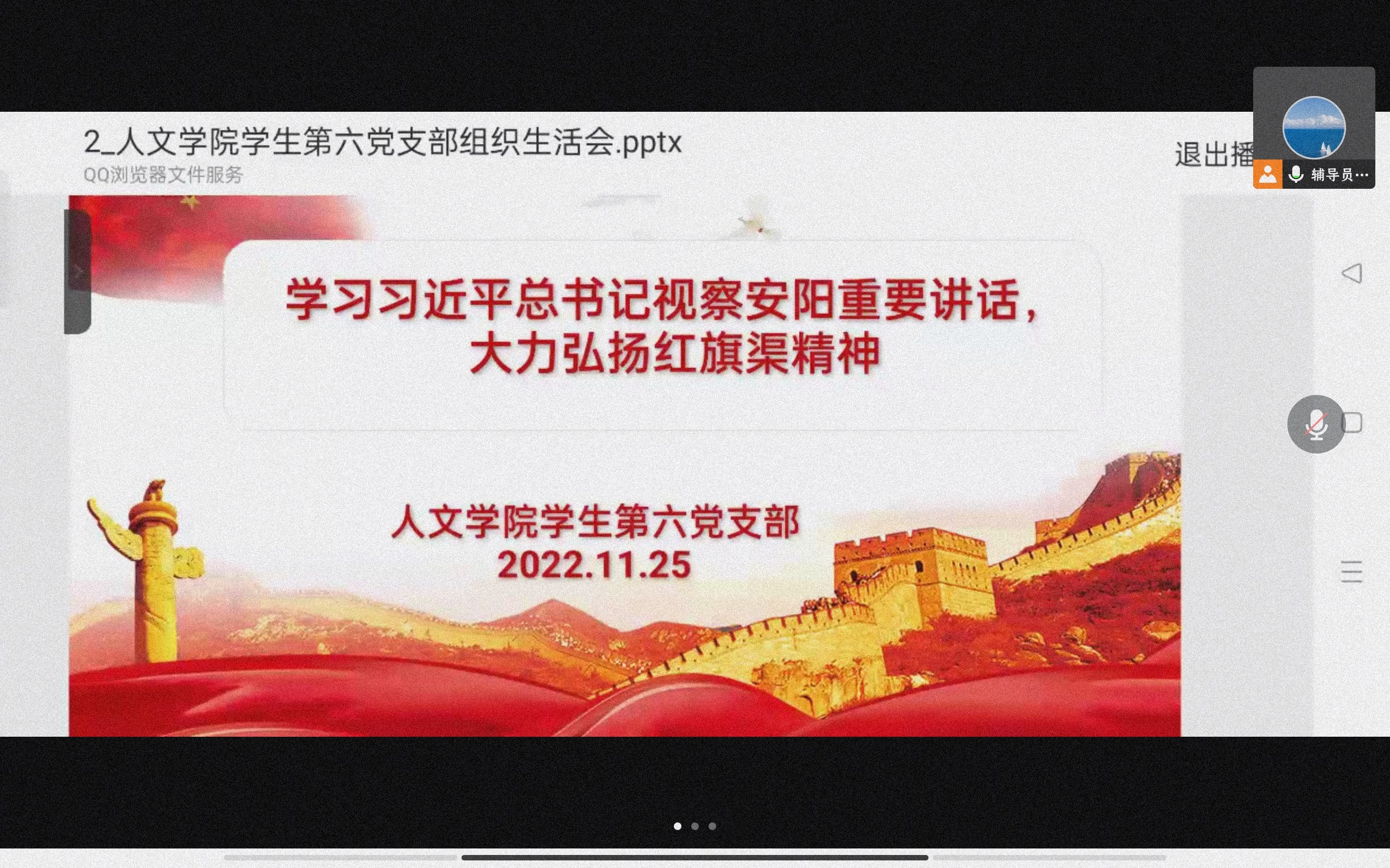 根据学校和学院党委要求,为深入学习贯彻党的二十大精神和习近平总书记视察河南安阳重要讲话,11月25日,国产欧美一区二区学生第六党支部召开以“学习习近平总书记视察安阳重要讲话精神,大力弘扬红旗渠精神”为主题的专题组织生活会并开展讨论交流。