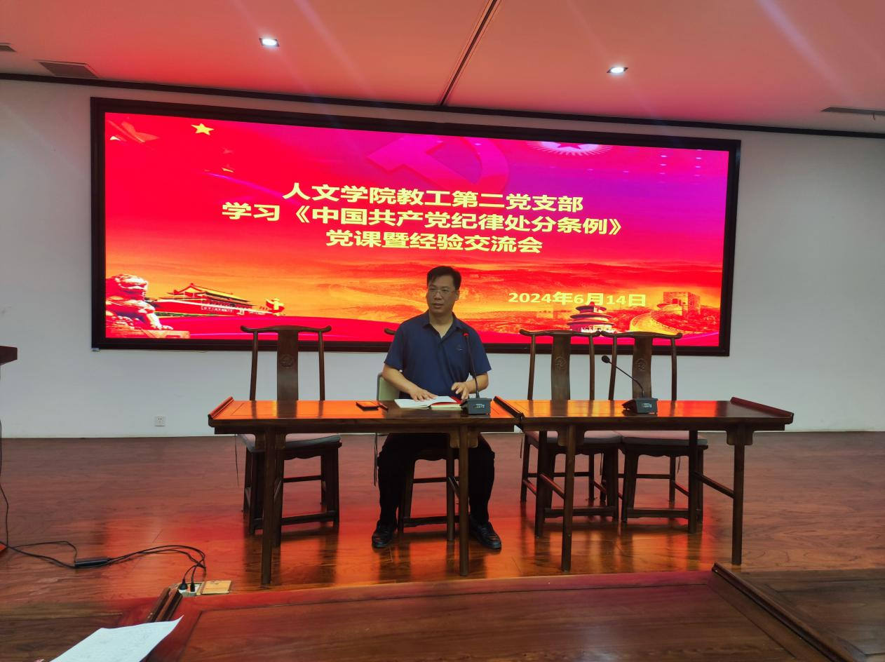 为进一步强化党员教育、纯洁党员队伍,国产欧美一区二区教工第二党支部全体党员6月14日下午于汉梁楼国学堂举行“学习《中国共产党纪律处分条例》党课暨经验交流会”。