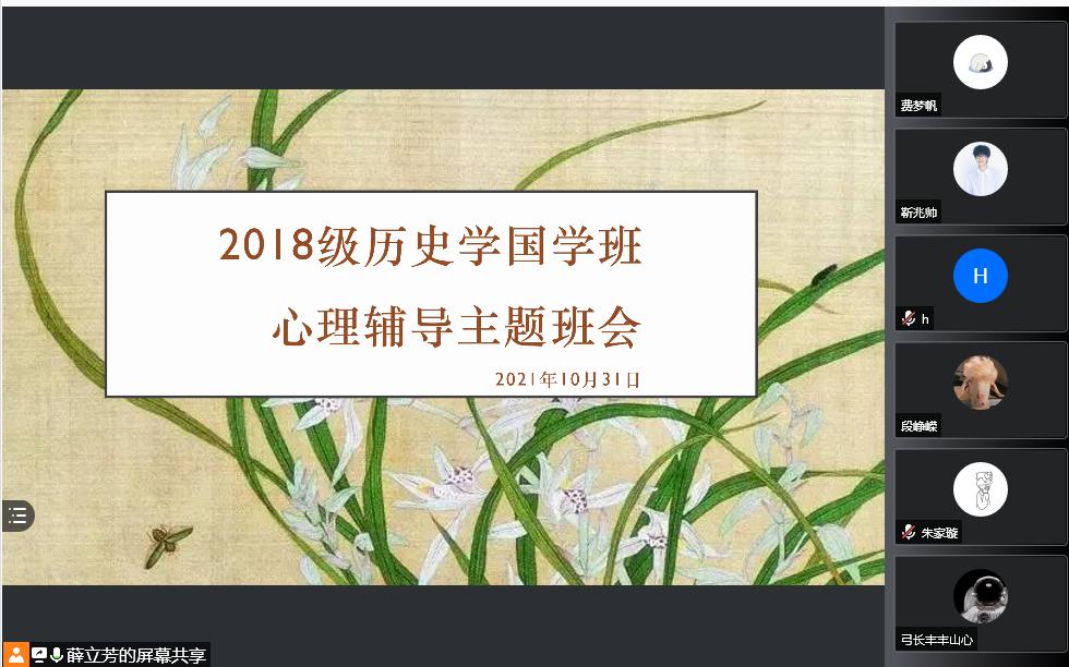 20级汉语言文学4班班主任刘海洲强调了心理健康对大学生抗御心理疾病、提高学习效率、完成学习任务、提高人际交往水平和生活质量的具有重要意义;20级文化产业管理2班在文秀山南侧草坪上开展了户外主题班会,班主任赵亮建议同学们积极参与业余活动,发展社会交往,通过参加社团活动缓解压力;汉语言20级3班班主任杨晓林向学生介绍了调节心理健康的几种方式;20级汉语言1班班主任张富林以真实案件为例,强调心理健康的重要性;18级历史国学班主任薛立芳开展线上班会,以《周易》举例,引导学生从传统经典中汲取健康的养分;19级文化产业管理1班班主任刘园园通过《我是演说家》中刘轩的演讲导入主题,让大家感触人生的不同阶段心理历程的变化,并对学生们目前的心里疑惑进行了一问一答式疏导。