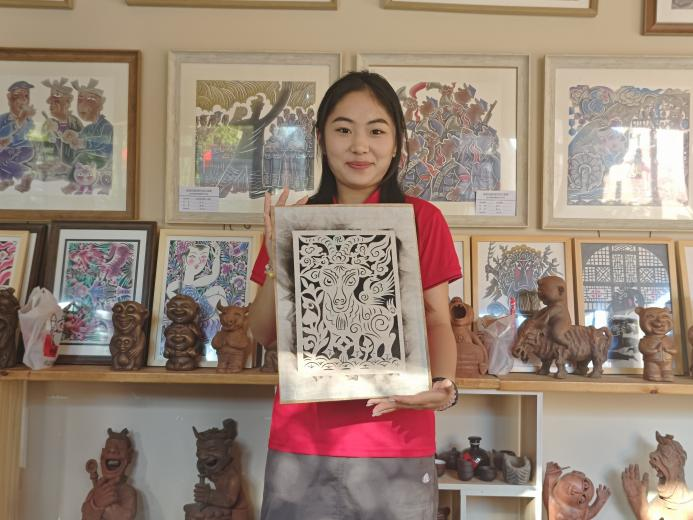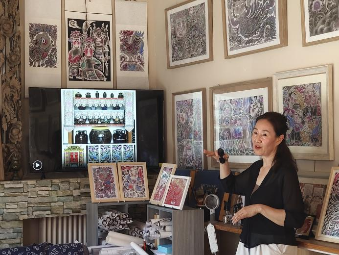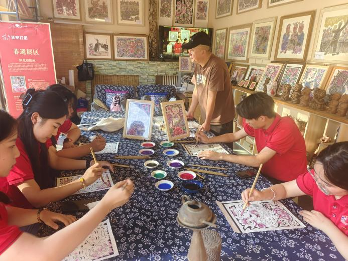 为寻根革命文化圣地、品味延安风土民俗,团队于8月11日、13日先后两次走进延安市宝塔区红街“延安陶塑”艺术馆学习陕西省非物质文化遗产保护项目——熏画。在两位老师的耐心教导下,完成了铺平剪纸、湿贴宣纸、进行熏制、揭下熏样、点染颜色五个步骤。点染过程中实践队员们发挥想象,按照自己的审美描红涂绿,肆意渲染,将一幅幅作品变成了绚丽多彩、千姿百态的图画。