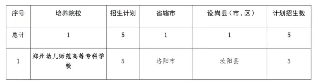 全省计划定向招收专科层次“学前教育”地方公费师范生5人,由培养高校在当年核定的普通招生计划总规模内统筹安排,均为师范类,计划类别为地方公费师范生,招生计划见附件 5。