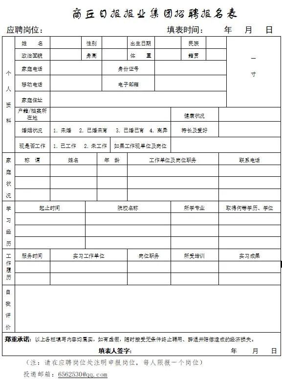 1.填写《商丘日报报业集团招聘报名表》(可通过商丘网www.sqrb.com.cn或商丘人才网www.sqrc.net下载),要求信息齐全、真实,包括政治面貌、健康状况、婚姻状况、学习经历、家庭主要成员情况等,缺项不予受理。