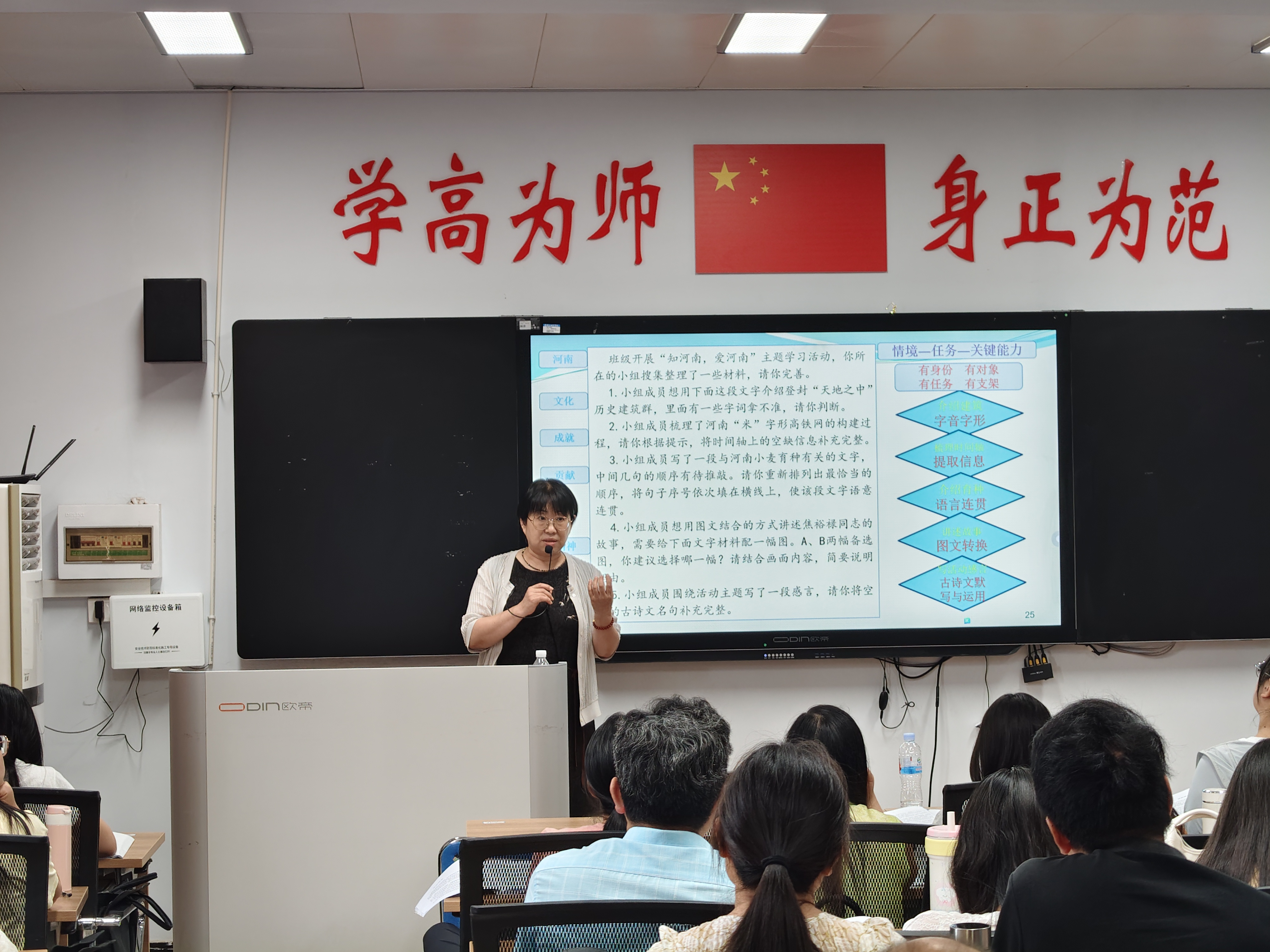 2025年8月6日,河南省基础教育课程与教学发展中心丁亚宏主任应邀来到商丘师范学院睢阳校区,为“国培计划2025”——商丘师范学院潢川县级骨干教师能力提升初中语文班授课。上午,丁亚宏主任以“初中语文2022课程标准的核心理念与关键突破”为题,指出教师要以“文化自信、语言运用、思维能力、审美创造”为纲,依托真实情境设计教学任务,把“阅读与鉴赏、表达与交流、梳理与探究”融为一体。