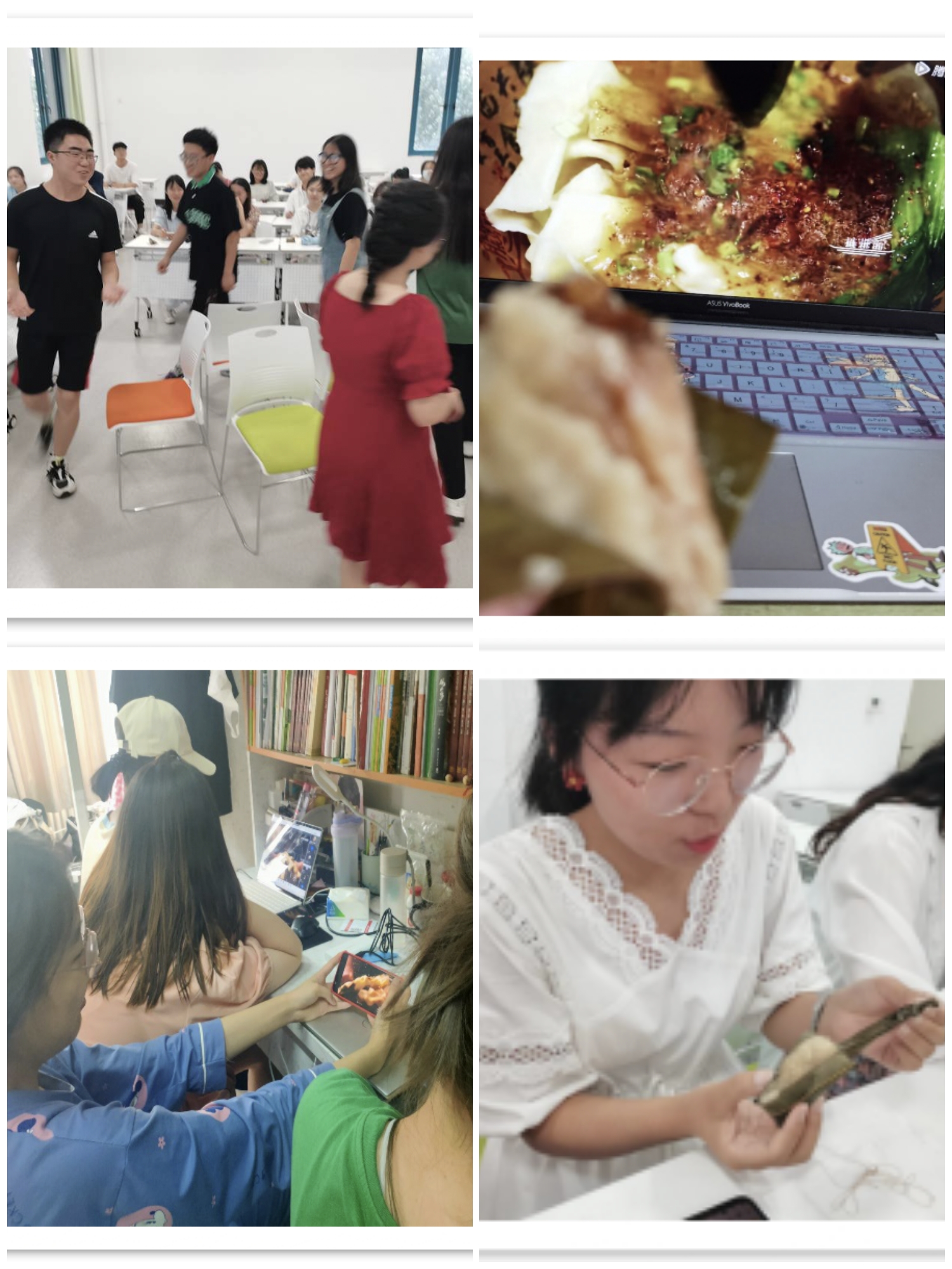此次活动为线上线下结合进行。线上同学们边吃粽子边看纪录电影。线下会议伊始,由班长谌蓓涵为大家讲解有关端午节的相关知识。讲解从端午历史渊源、相关传说与故事、节日民俗与活动、文字记载四个部分展开,使大家对端午节的了解更进一步。后又通过击鼓传花、抢凳子等小游戏增进同学间感情,同时共同庆祝端午佳节。游戏过后同学们共同品尝热气腾腾的粽子,感受中国传统美食的独特魅力。