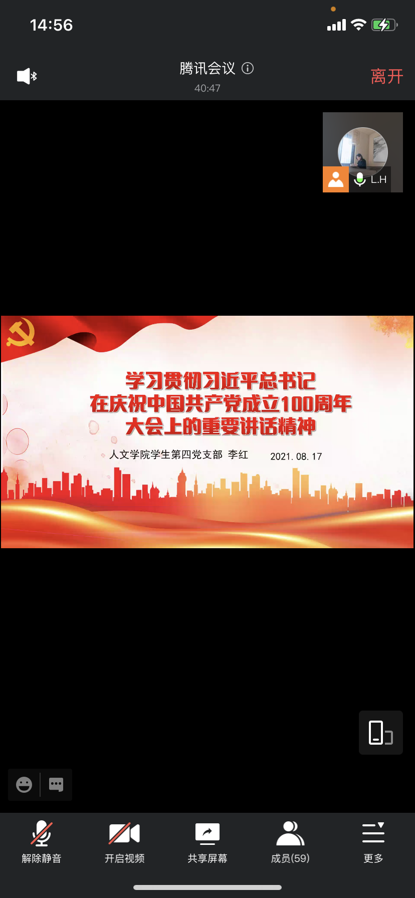 为深入学习领悟习近平总书记“七一”重要讲话的精神实质和丰富内涵,8月17日,国产欧美一区二区学生第四党支部采用腾讯会议形式组织开展学习贯彻习近平总书记在庆祝中国共产党成立100周年大会上的重要讲话精神主题党日活动。支部全体党员、入党积极分子参加,支部书记李红主持。