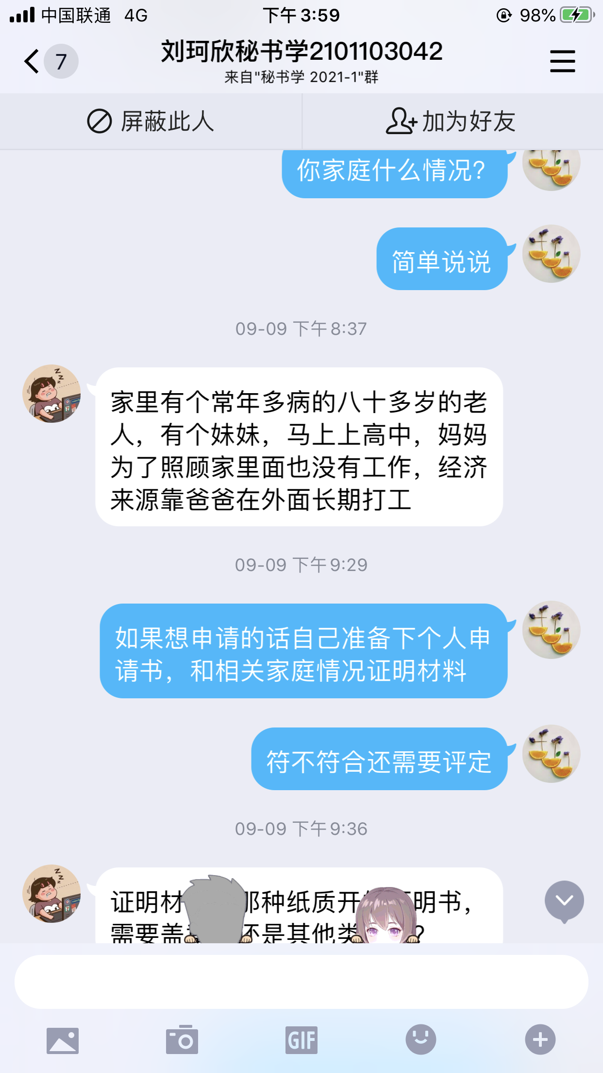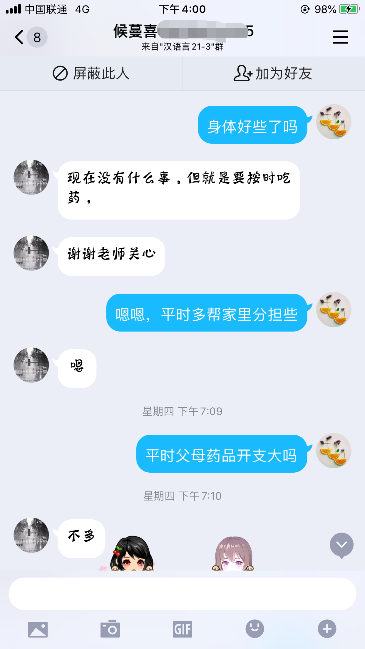 由于学校尚未开学,所以本次谈话活动主要采用线上视频聊天、微信和QQ沟通等方式进行。我院的各位辅导员老师在对学院困难学生进行了摸底排查之后,对“原建档立卡学生、低保、城市困难职工家庭的子女和特困人员、残疾人子女、孤儿、残疾儿童以及受本次疫情及河南汛灾影响较大学生等特殊人群进行了深入的了解和谈话沟通。