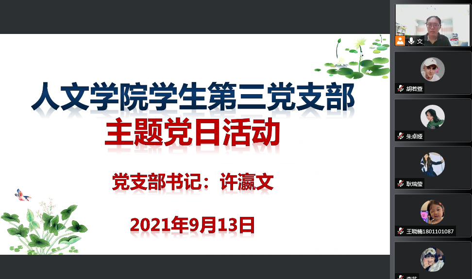 为深化党史学习教育,提高党员党性修养,9月13日下午,国产欧美一区二区学生第三党支部在线上开展9月份主题党日活动,进行暑期党史学习的心得交流。本次活动由支部书记许瀛文主持,支部全体学生党员参加。