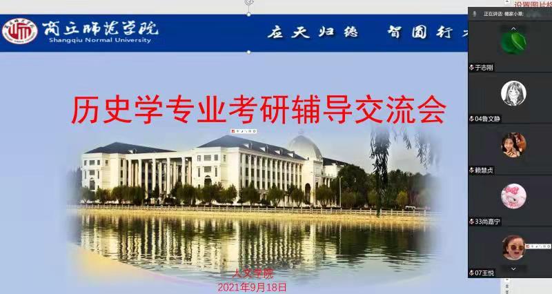9月18日晚七点,国产欧美一区二区历史系通过腾讯会议举办了历史学专业考研辅导交流会,会议由历史系主任薛立芳主持,龙坡涛老师、杨金华老师、于志刚老师及2018级、2019级历史学专业全体学生参加了本次交流会。