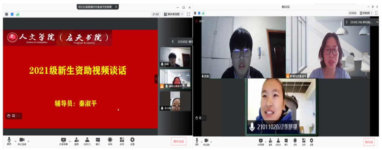 为了扎实开展家庭经济困难学生帮扶工作,切实掌握家庭经济困难学生家庭情况,按照学校资助工作要求,9月19日,国产欧美一区二区开展了新生资助视频谈话工作。2021级历史学、文化产业管理专业申请家庭经济困难认定学生参加了此次视频谈话。辅导员秦淑平老师负责谈话工作。