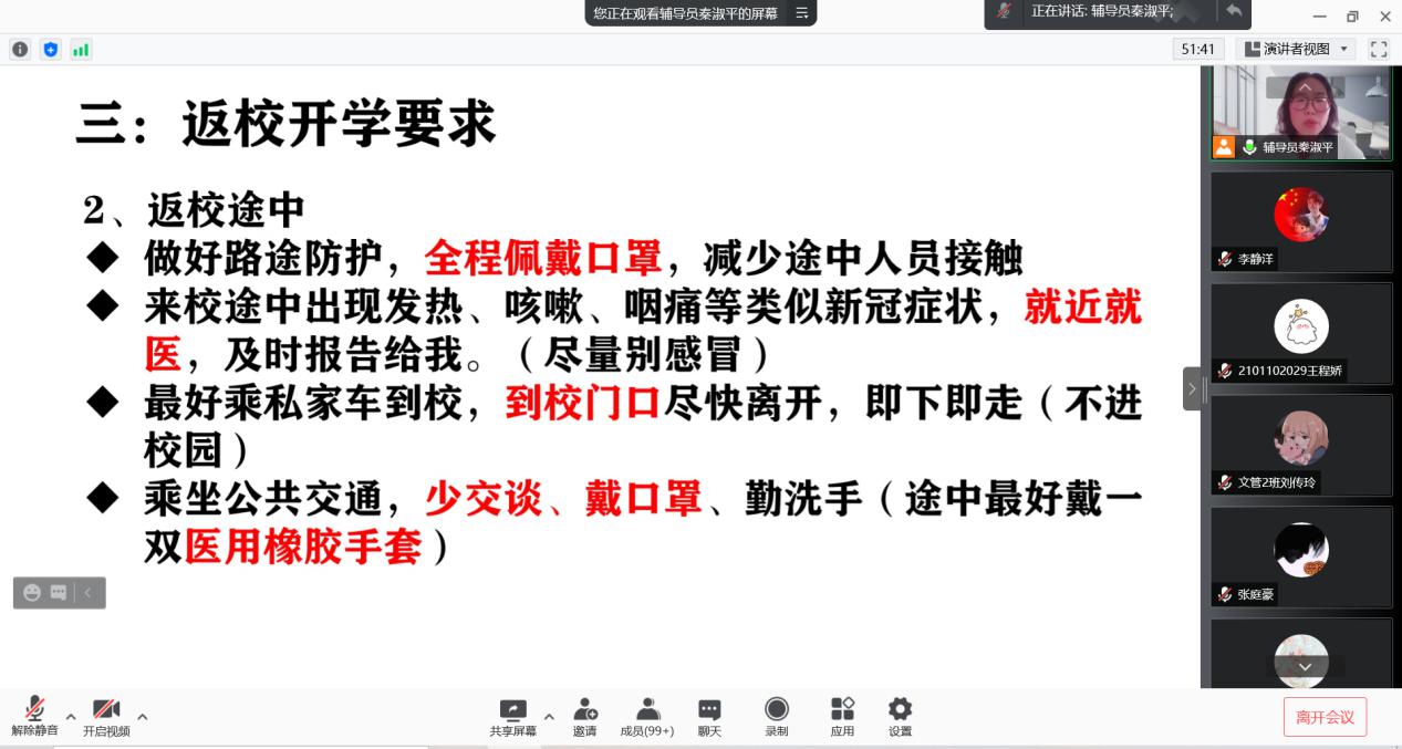 接着,秦老师重点强调,要求同学们假期期间做到不跨市移动,经过个人申请,学校审核学生返校开学条件后方可到校报到;开学前、返校途中应当做好疫情防护措施;学生返校开学后严格执行学校疫情防控网格化管理制度,据实上报个人健康信息。
