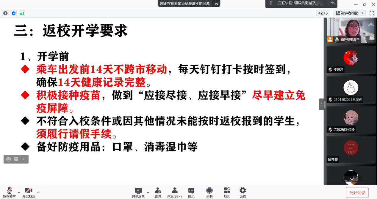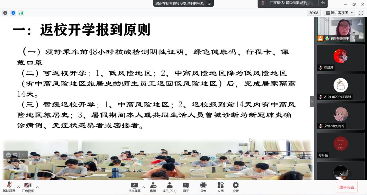 首先,秦老师围绕学校下发的《关于2021年秋季学期师生返校和2021级新生入学报到有关安排的通知》,带领同学们认真学习了有关新生报到原则、返校开学时间、返校条件等内容。
