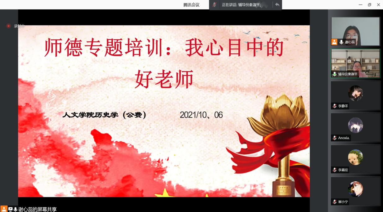 为全面贯彻习近平总书记关于教育的重要论述和全国、全省教育大会精神,全面加强和改进新时代师德师风建设,提升历史学专业师范生的师德水平,10月6日,2021级历史学专业开展“我心目中的好老师”线上师德教育活动;历史学系主任薛立芳老师、班主任于志刚老师、辅导员秦淑平老师以及2021级历史学专业全体学生参加了会议。