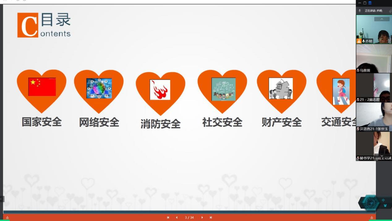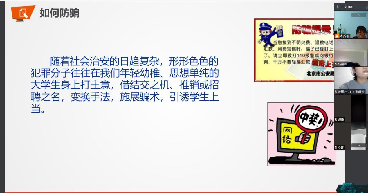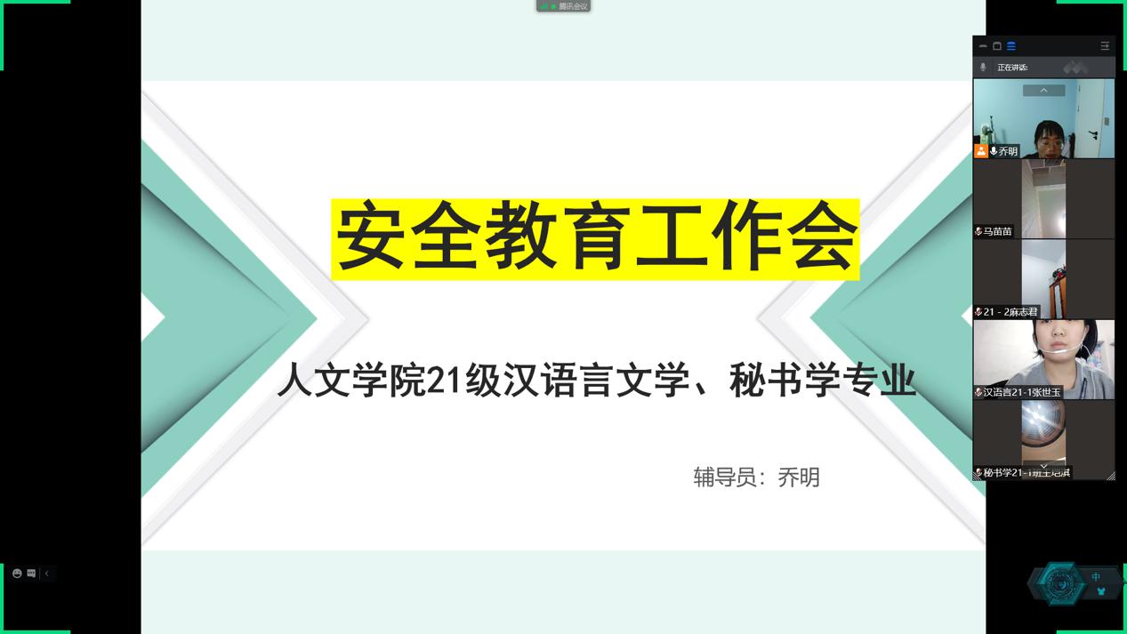 国庆假期即将结束,为了加强学生的安全意识,提高防范意识,10月6日,国产欧美一区二区秘书学和汉语言文学专业辅导员乔明老师通过腾讯会议召开安全教育工作会,2021级秘书学和汉语言文学专业全体学生参加。