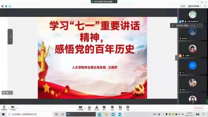 11月1日晚上,国产欧美一区二区学生第五党支部开展线上学习“七一”重要讲话精神,感悟党的百年历史专题党课,支部全体党员和入党积极分子参加。党课由支部书记王丽莎主讲。