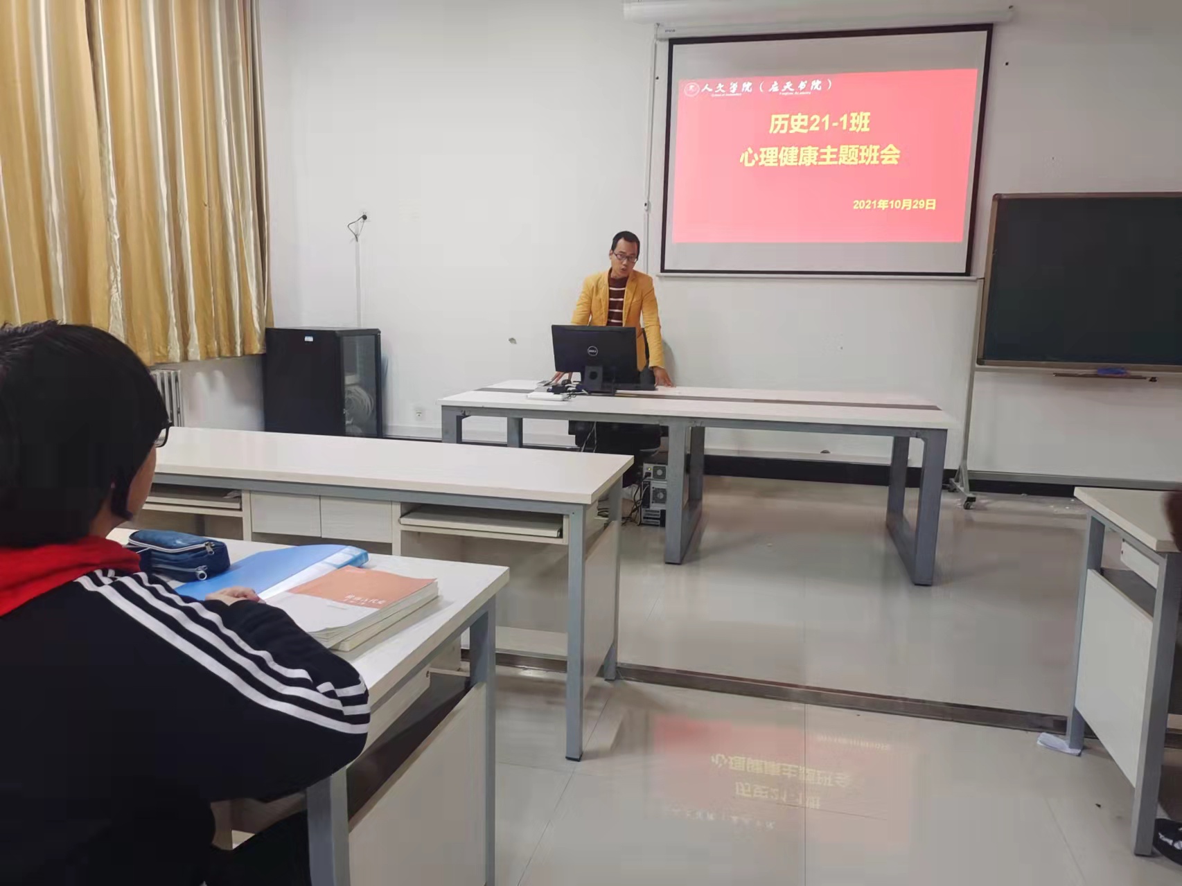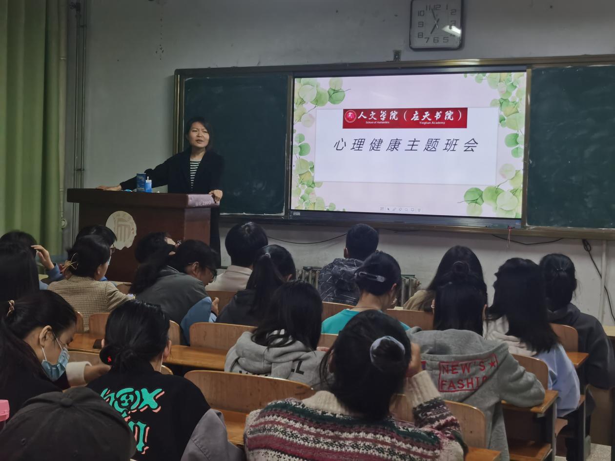 20级汉语言文学4班班主任刘海洲强调了心理健康对大学生抗御心理疾病、提高学习效率、完成学习任务、提高人际交往水平和生活质量的具有重要意义;20级文化产业管理2班在文秀山南侧草坪上开展了户外主题班会,班主任赵亮建议同学们积极参与业余活动,发展社会交往,通过参加社团活动缓解压力;汉语言20级3班班主任杨晓林向学生介绍了调节心理健康的几种方式;20级汉语言1班班主任张富林以真实案件为例,强调心理健康的重要性;18级历史国学班主任薛立芳开展线上班会,以《周易》举例,引导学生从传统经典中汲取健康的养分;19级文化产业管理1班班主任刘园园通过《我是演说家》中刘轩的演讲导入主题,让大家感触人生的不同阶段心理历程的变化,并对学生们目前的心里疑惑进行了一问一答式疏导。