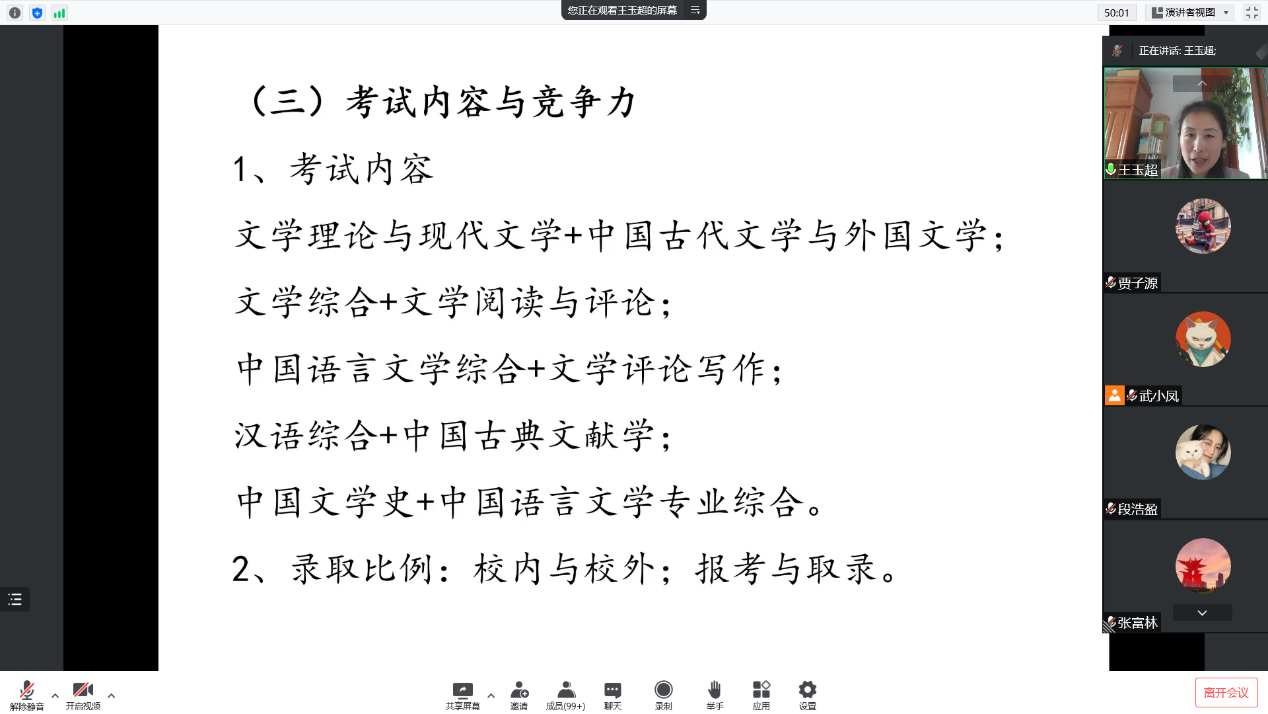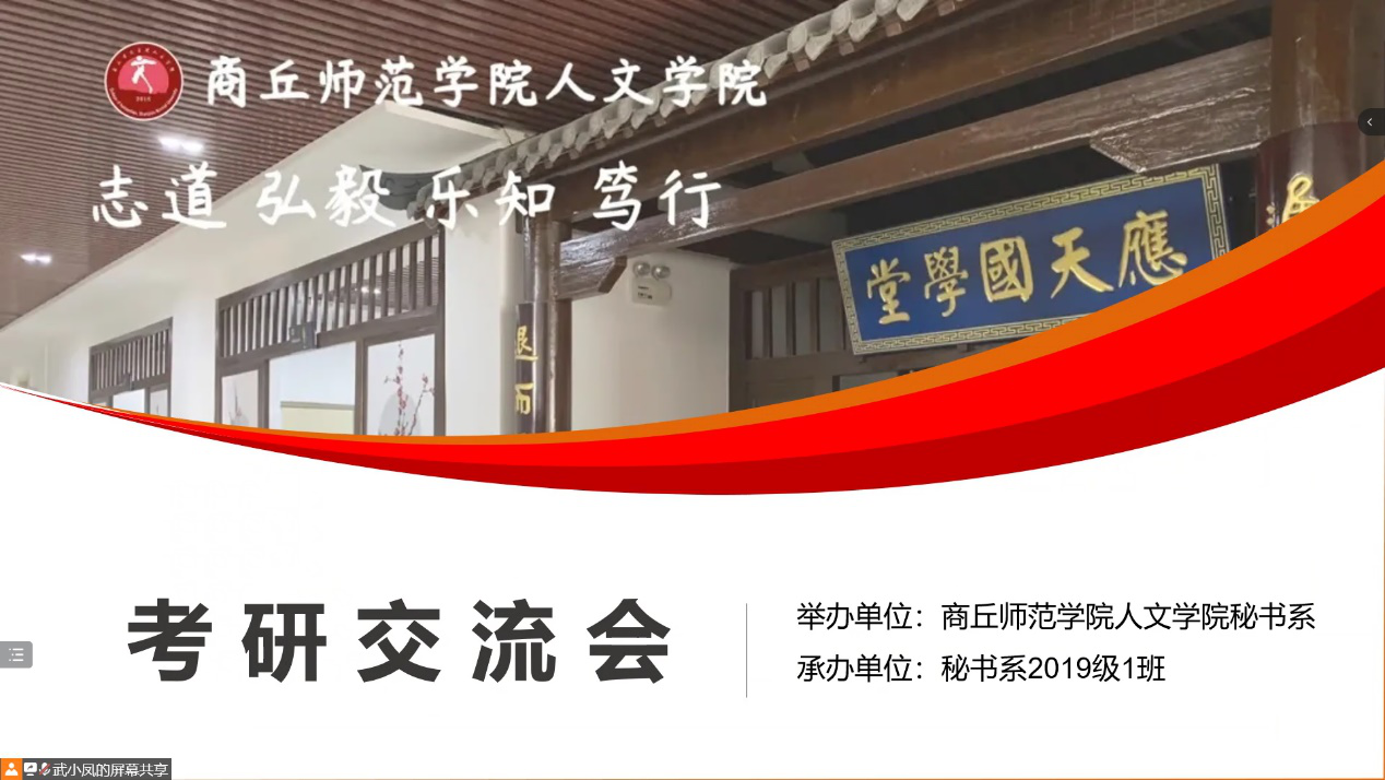 5月21日上午9:00,由国产欧美一区二区文秘系主办、文秘系19-1班承办的“考研经验交流会”通过腾讯会议进行线上直播。来自国产欧美一区二区秘书学、汉语言文学专业师生一百余人参加交流会。会议由秘书学专业武小凤同学主持。