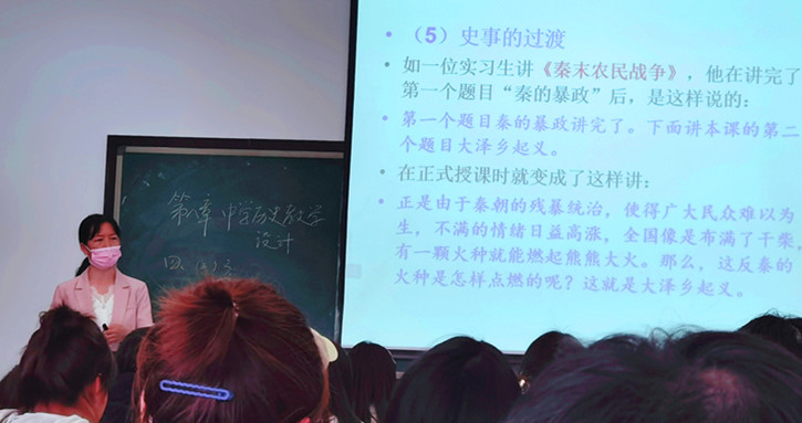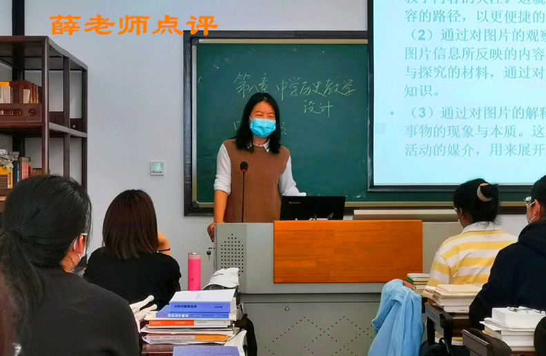 接着,魏老师梳理了教材分析的一般程序和方法,强调了教材分析对于上好课的重要性,然后,魏老师结合中学历史教学中出现的典型课例,分别给同学们讲述了面对学生的提问应该如何应对、史事的过渡方法、图片的使用方法等具体的教学策略。在讲授过程中,魏老师表达清晰,讲解流畅,尤其注重启发学生思考,师生互动自然。整个课堂气氛比较活跃,学生参与度较高,学习效果很好。