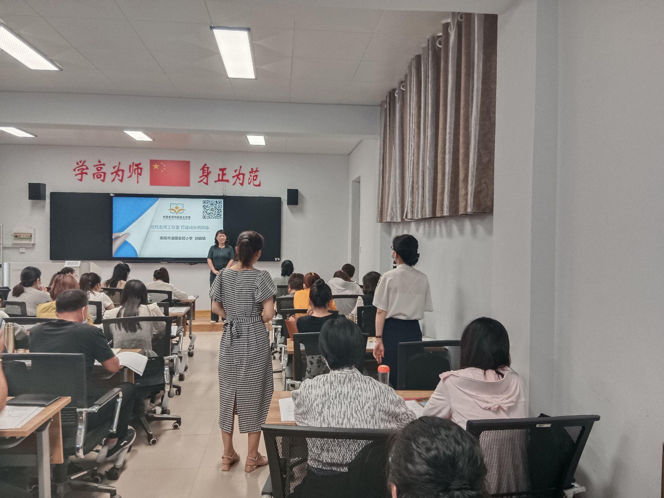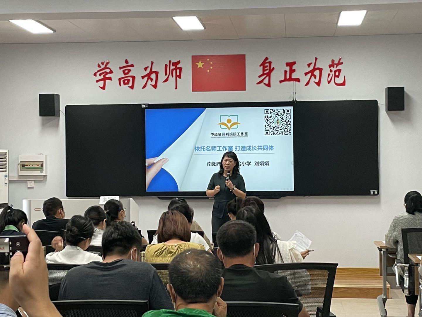 2022年8月23日上午,“国培计划(2022)”永城市项目县小学语文骨干教师能力提升研修班有幸邀请到了中原名师刘娟娟老师到班进行专题讲座。刘娟娟老师以“依托名师工作室,打造成长共同体”为题,进行了精彩的分享。小学语文研修班全员五十名教师聆听了讲座。