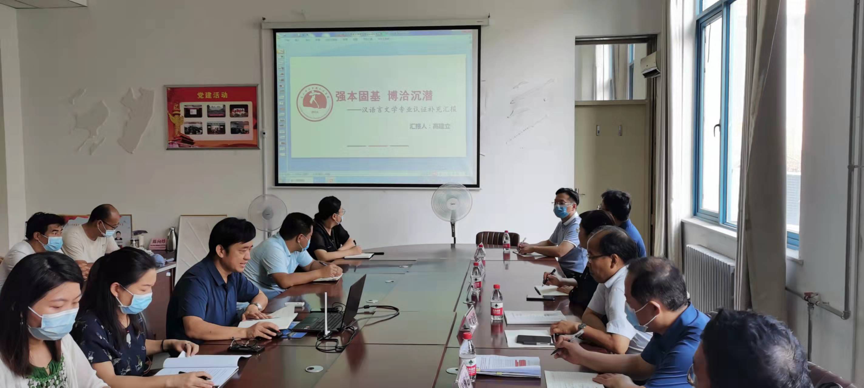 高建立院长首先汇报了汉语言文学专业认证工作的进展情况,以PPT形式就专家进校认证的补充汇报进行了预汇报,郭文佳副校长和其他几位专家就补充汇报材料提出了具体的修改指导意见。