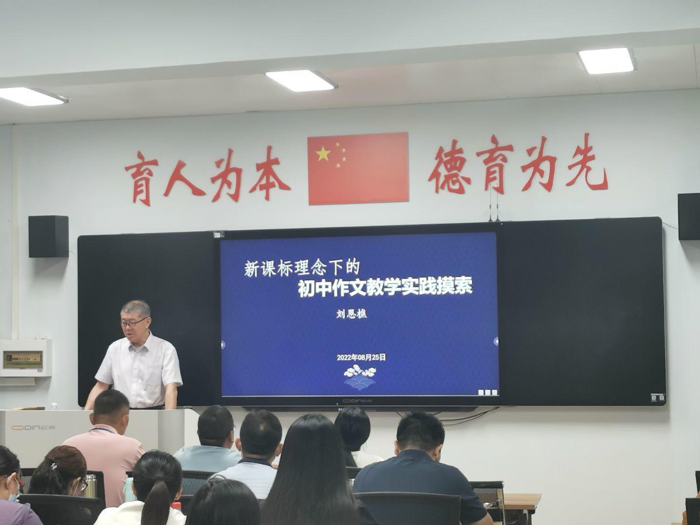 2022年8月25日上午,来自江苏省昆山市希兵中学的特级教师刘恩樵老师为商丘师范学院“国培项目”永城市骨干教师教学技能提升培训--初中语文班学员上了一堂受益匪浅、别开生面的语文课,以《新课标理念下的初中作文教学实践摸索》为主题。