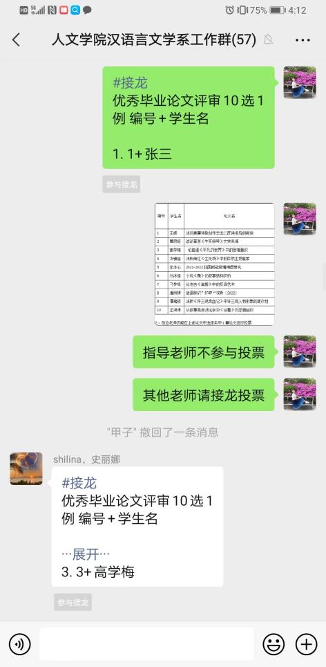 紧接着,汉语言系对本年度优秀等次的毕业论文进行校级优秀论文评选,由于疫情原因,投票采用了线上形式进行,由老师在事先审阅过的十篇优秀论文中选择最优秀的一篇,将其编号与作者名进行接龙投票,老师们积极参与投票,张辉老师指导的《2021-2022我国新冠疫情用语言研究》、庞可慧老师指导的《话语标记“好吧”探析》、刘艳老师指导的《论路遥<平凡的世界>中的苦难意识》以及杨鉴生老师指导的《浅谈姜夔诗歌创作走出江西诗派后的新变》都获得较多票数,最终论文《2021-2022我国新冠疫情用语言研究》以最高票数被推选为校级优秀论文,并将代表汉语言系参加省级优秀毕业论文评选。