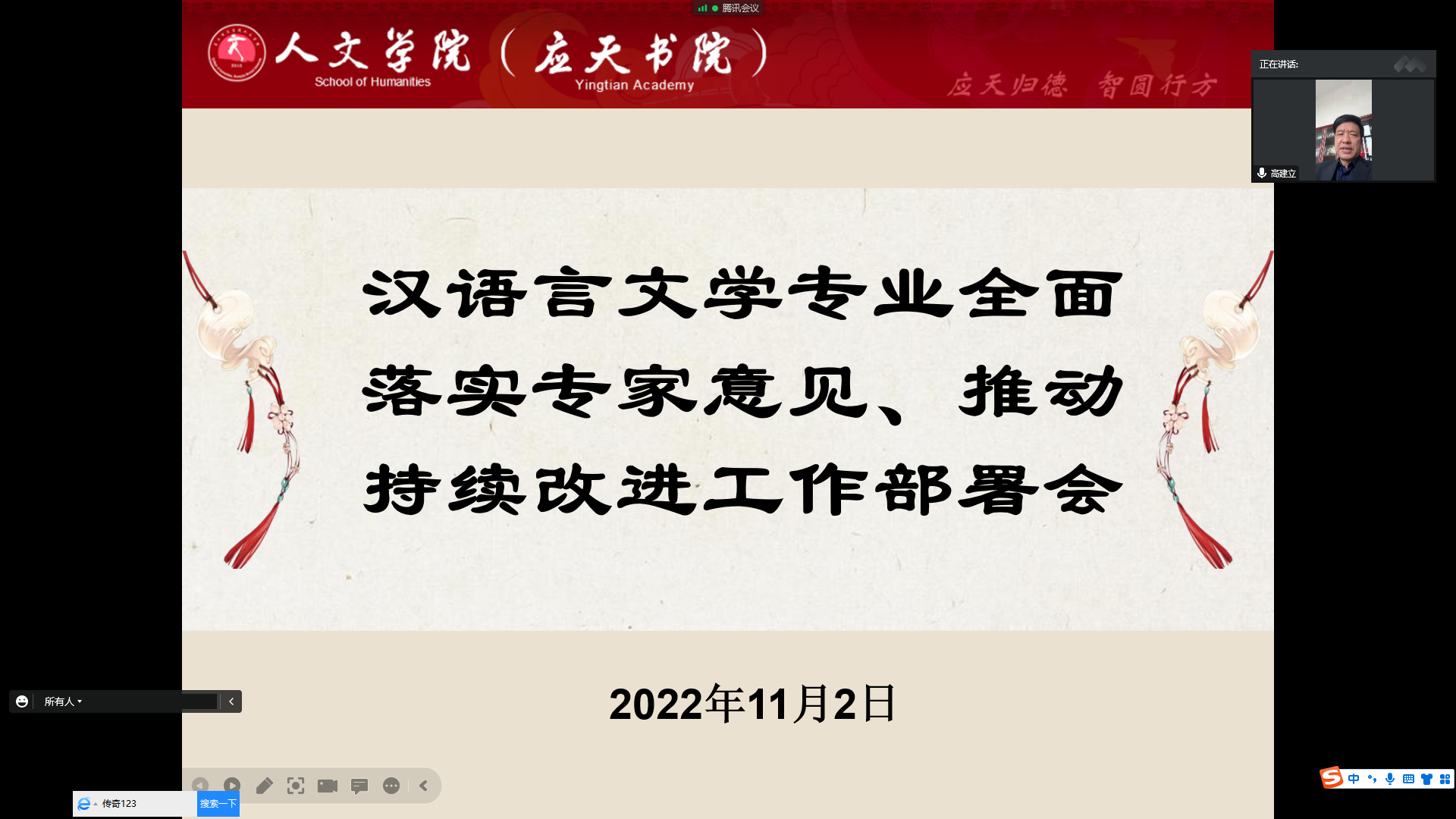 10月23日至30日,河南省教育评估中心组织专家对汉语言文学专业进行线上认证考察工作,30日上午,专家组反馈了认证考察意见。为全面贯彻落实专家组意见、建议,国产欧美一区二区于11月2日下午举行了线上持续改进工作部署会,汉语言文学专业认证工作组全体同志和认证工作联络员等参加了会议。会议由高建立院长主持。