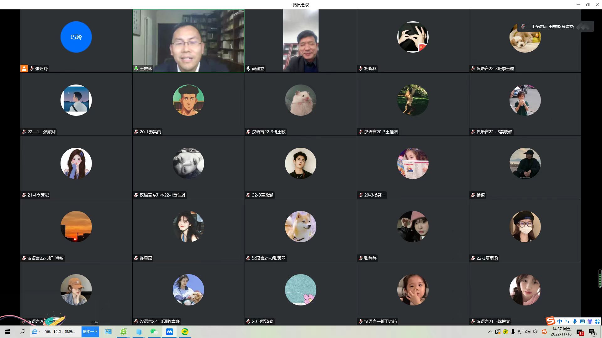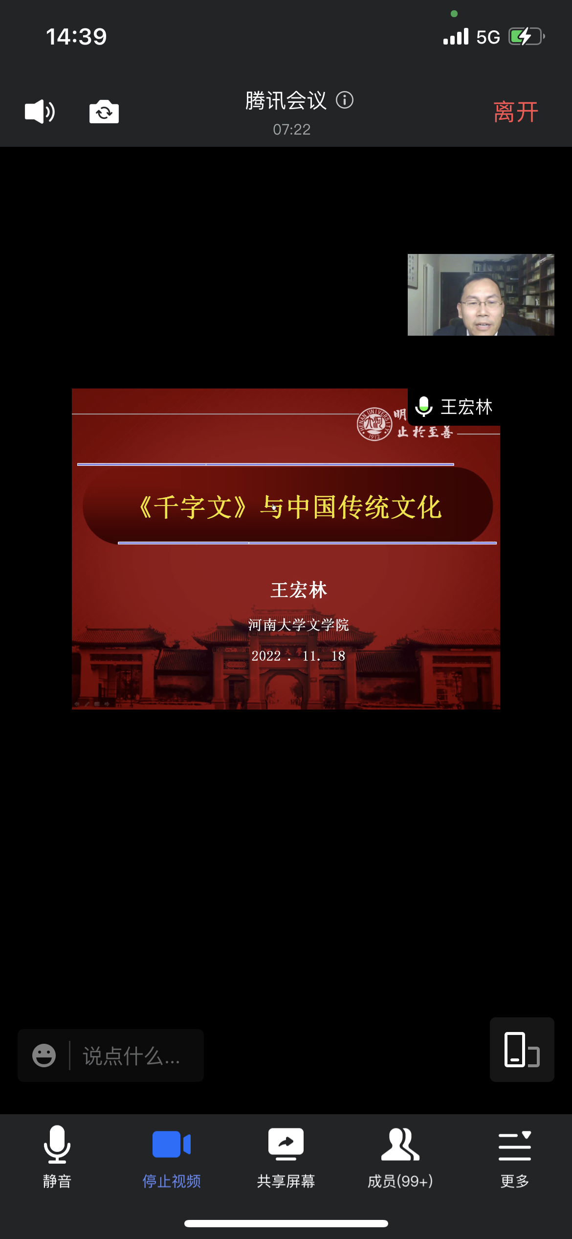 2022年11月18日下午,王宏林教授应邀给国产欧美一区二区全体师生做了一场题为“《千字文》与中国传统文化”的学术报告,高建立院长主持报告会。