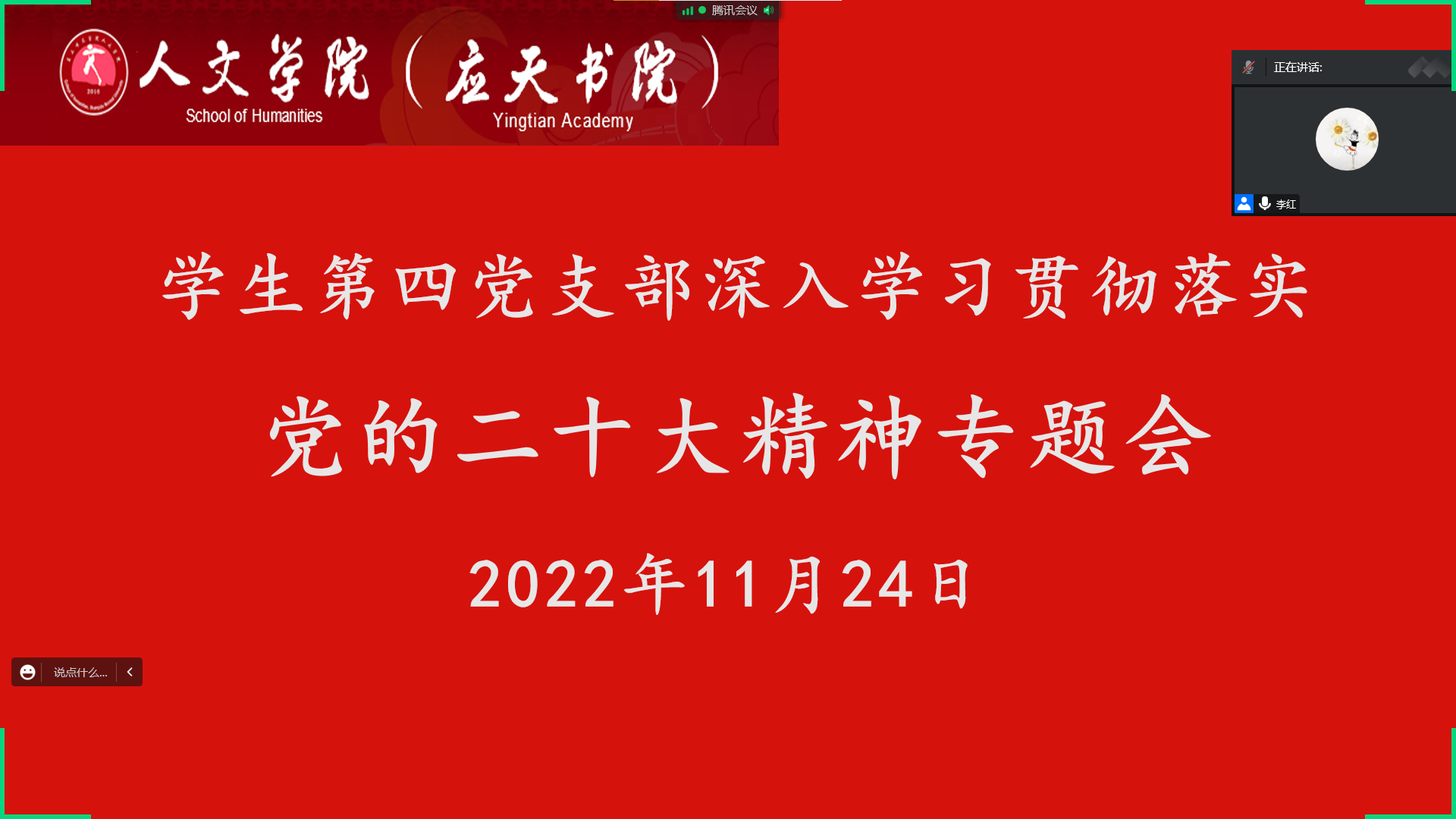为深入学习宣传贯彻党的二十大精神,11月24日晚,国产欧美一区二区学生第四党支部通过腾讯会议方式召开支部大会。会议由学生第四党支部书记李红主持,全体支部成员参会。