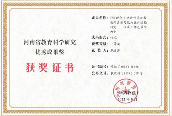 2022年5月,河南省教育厅发布《河南省教育厅办公室关于开展2022年度河南省教育科学研究优秀成果评选工作的通知》(教办教科〔2022〕172号),经资格审查、复制比检测、专家评审、省教育科学规划领导小组审核,八月份评出结果。我院历史系教师龙坡涛博士的论文《OBE理念下地方师范院校教师素质与能力提升途径研究—以商丘师范学院为例》荣获一等奖。