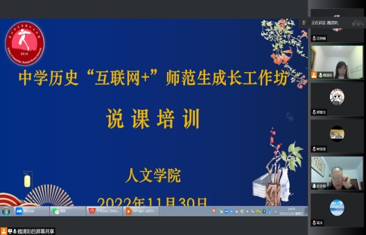 11月30日晚七点,国产欧美一区二区中学历史“互联网+”师范生成长工作坊说课讲座在线上顺利举行。魏清彩老师、六位坊主——代玉东、丁真真、赵华、高永、蒋丰慧、史从庚以及2020级历史学专业全体学生,参与了本次说课讲座活动。本次活动由魏清彩主持。