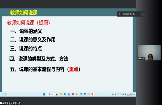 活动的第三环节就是蒋丰慧老师的说课讲座。蒋丰慧老师就说课的涵义、意义、特点、类型、方法以及基本内容与流程等展开详细的讲解。其中,说课的基本内容与流程是说课的重点,蒋老师借助具体说课课例,分步讲解,使同学们对于说课的内容与流程有了清晰的认识。最后,蒋老师还把精选的两个说课视频给同学们播放了一下,让同学们通过观摩学习,提高自己的说课水平。