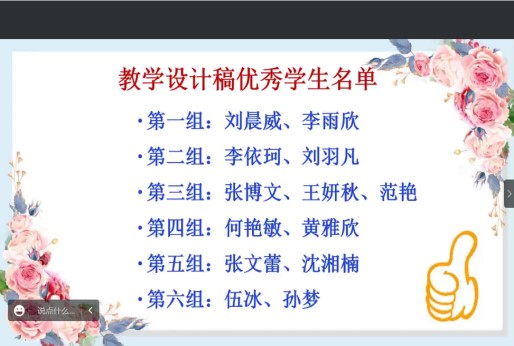 活动伊始,魏清彩宣读了上一阶段在撰写教学设计稿中表现优秀的同学名单,并对她们提出表扬,希望同学们继续努力,在下一阶段取得更好的成绩。