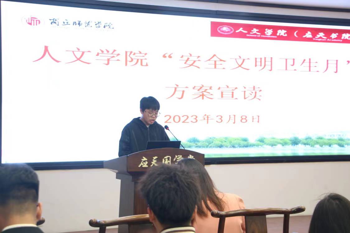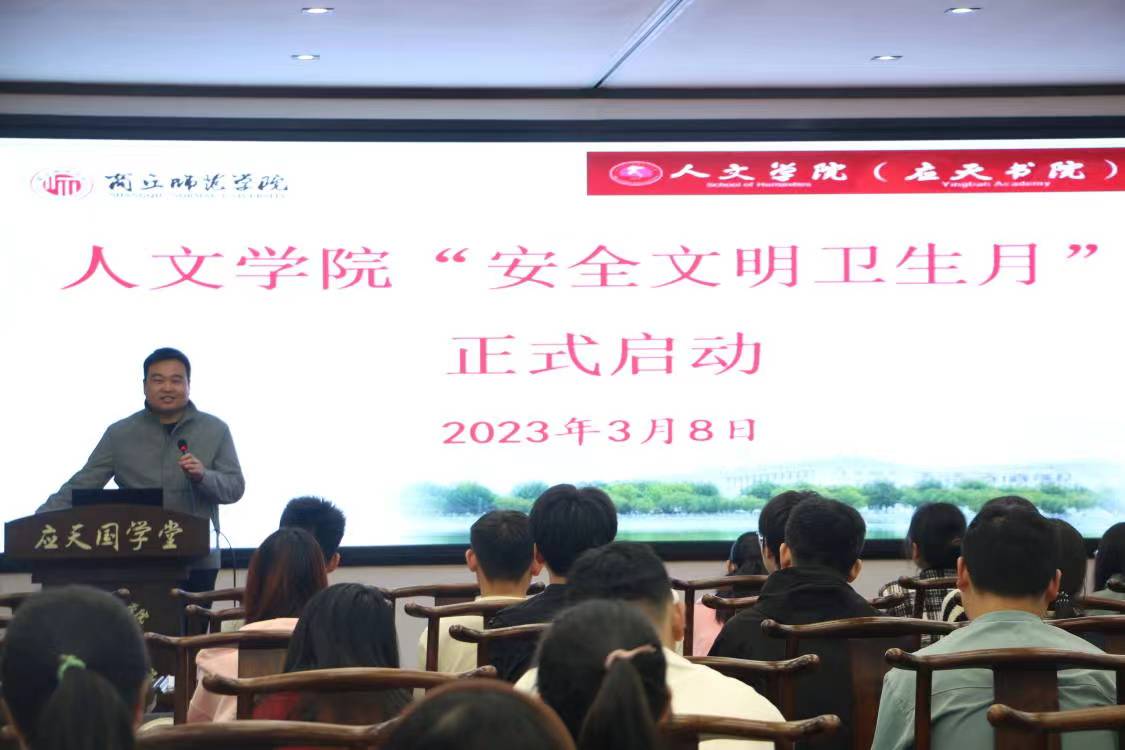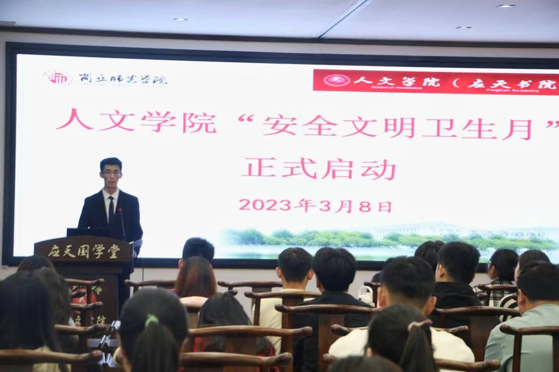 为提高广大人文学子的安全文明意识和思想道德素养,营造文明和谐的育人环境,2023年3月8日,国产欧美一区二区于汉梁楼国学堂举行“安全文明卫生月”启动仪式。学院党委副书记卢忠雷、团委书记李红、全体辅导员老师和各年级学生代表出席了本次会议。活动由学生兼职团委副书记杨镇主持。