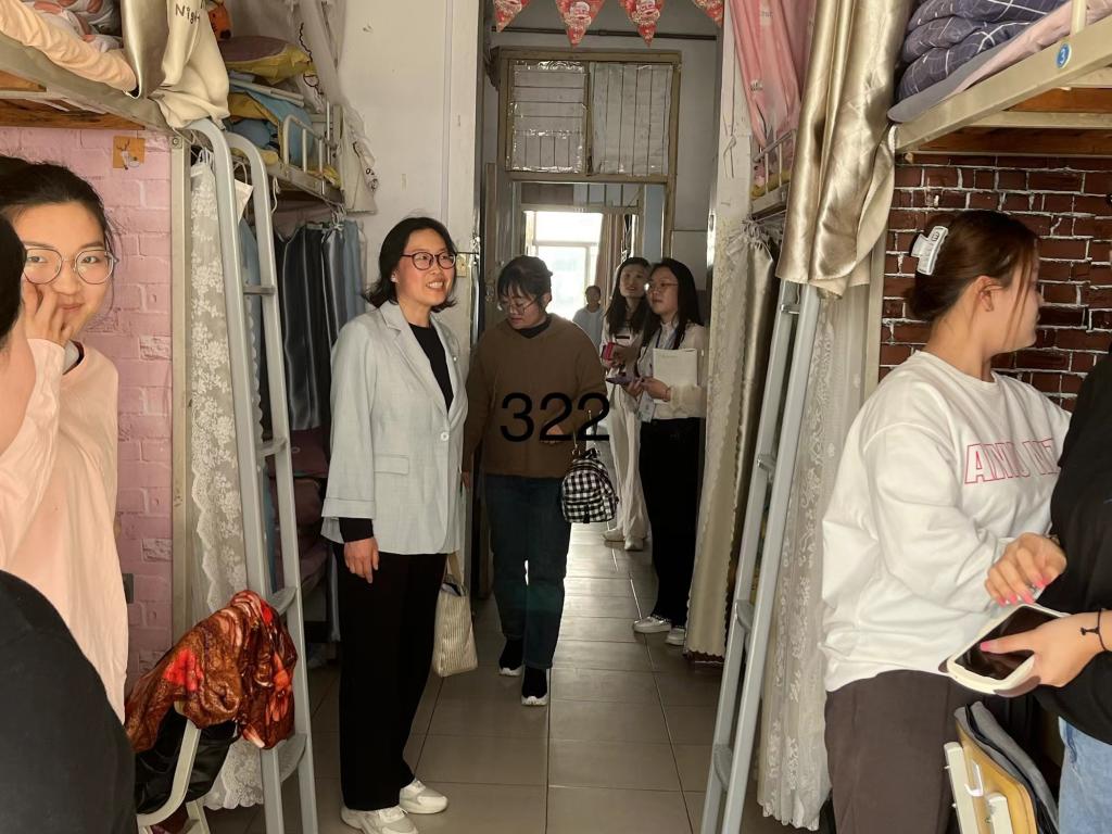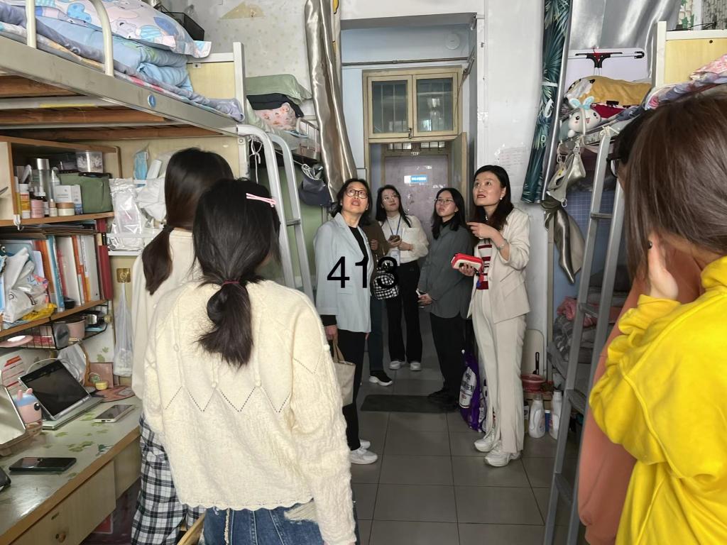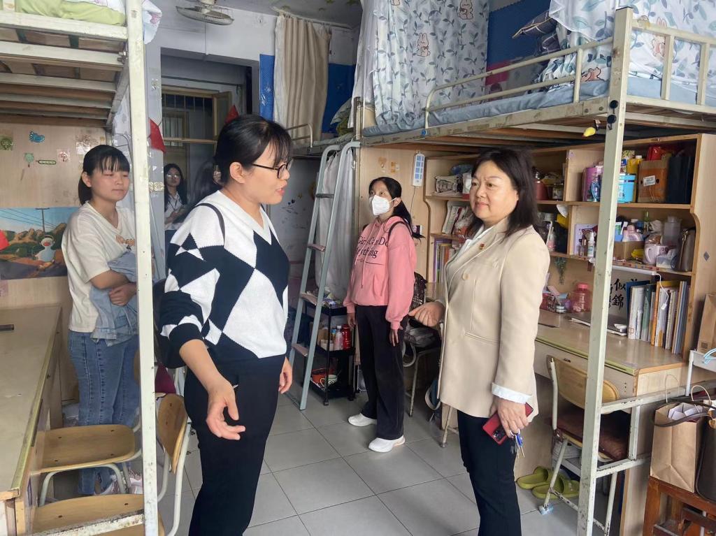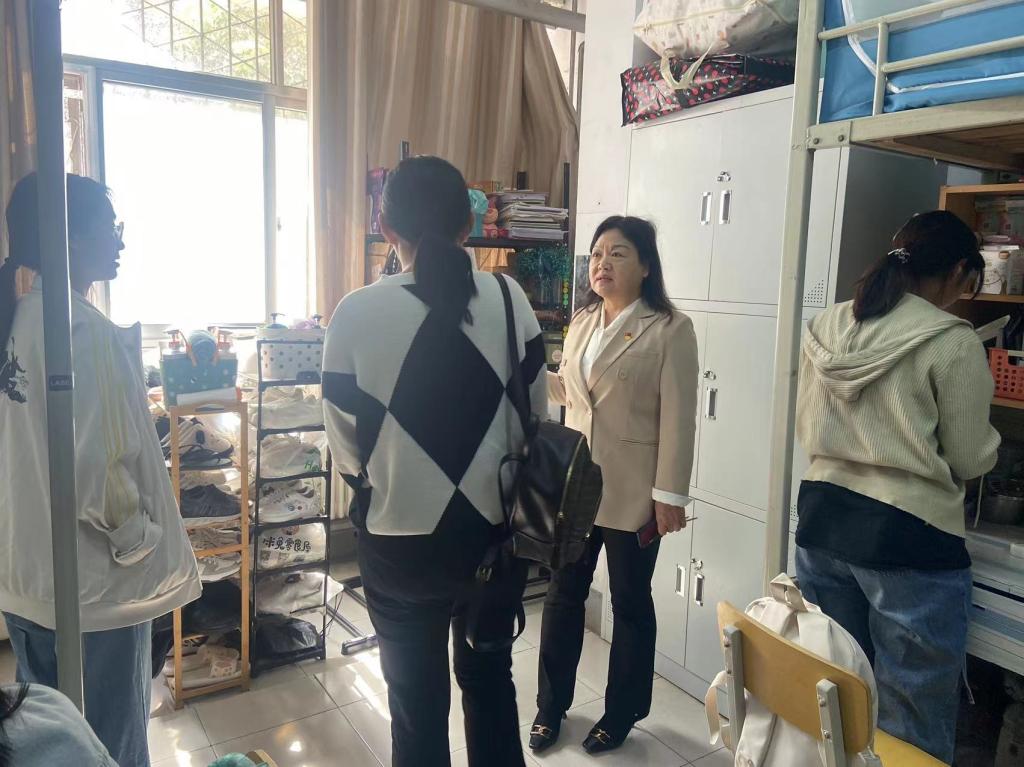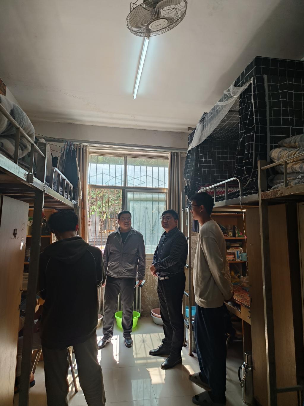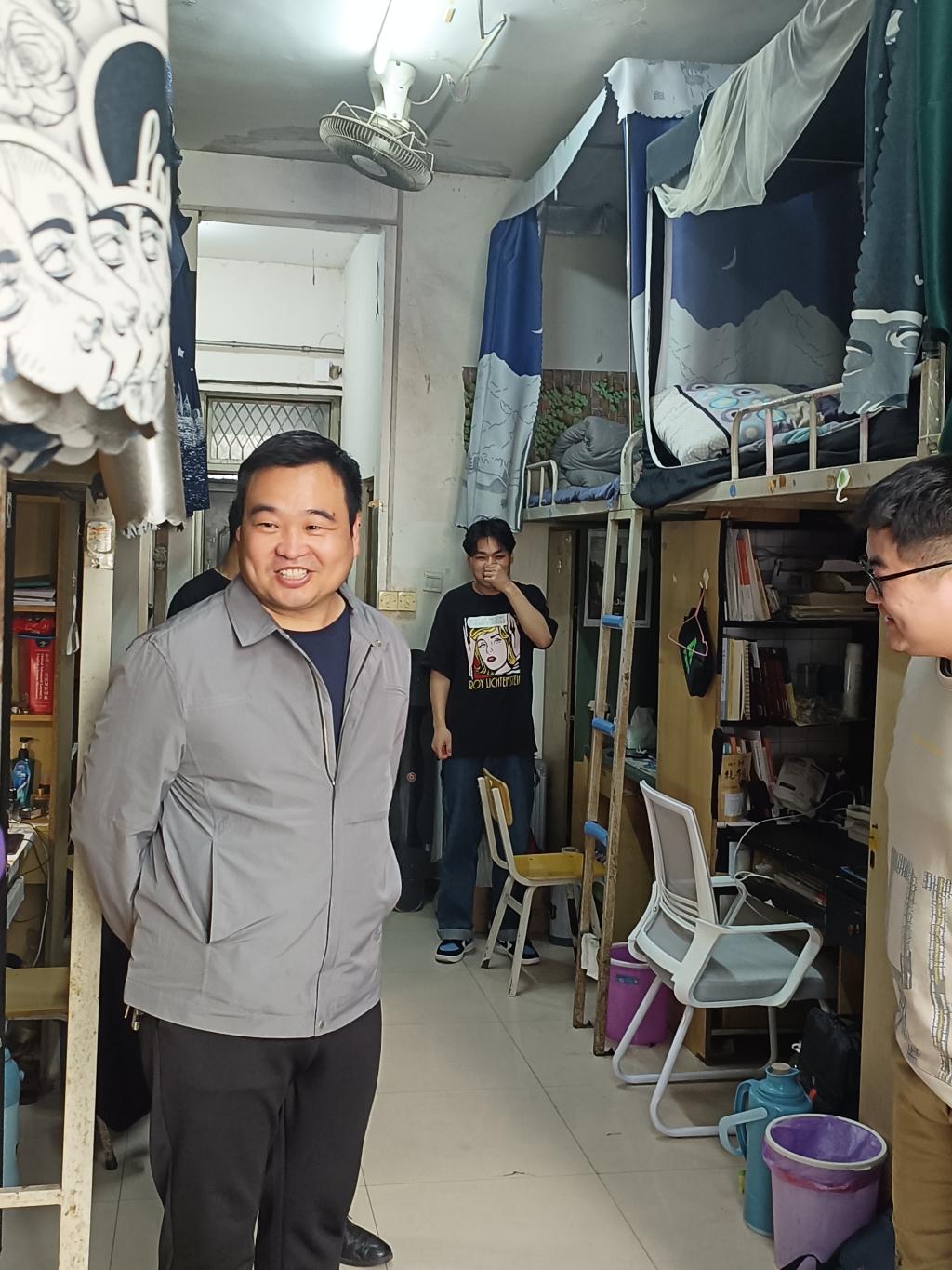 走访过程中,陈晓明一行与同学们进行了亲切交流,详细了解学生的学习生活、安全卫生和宿舍环境等方面情况,叮嘱同学们要养成良好的生活卫生习惯,注意身体健康,保持积极的心理状态,共同营造一个安全和谐的寝室环境。