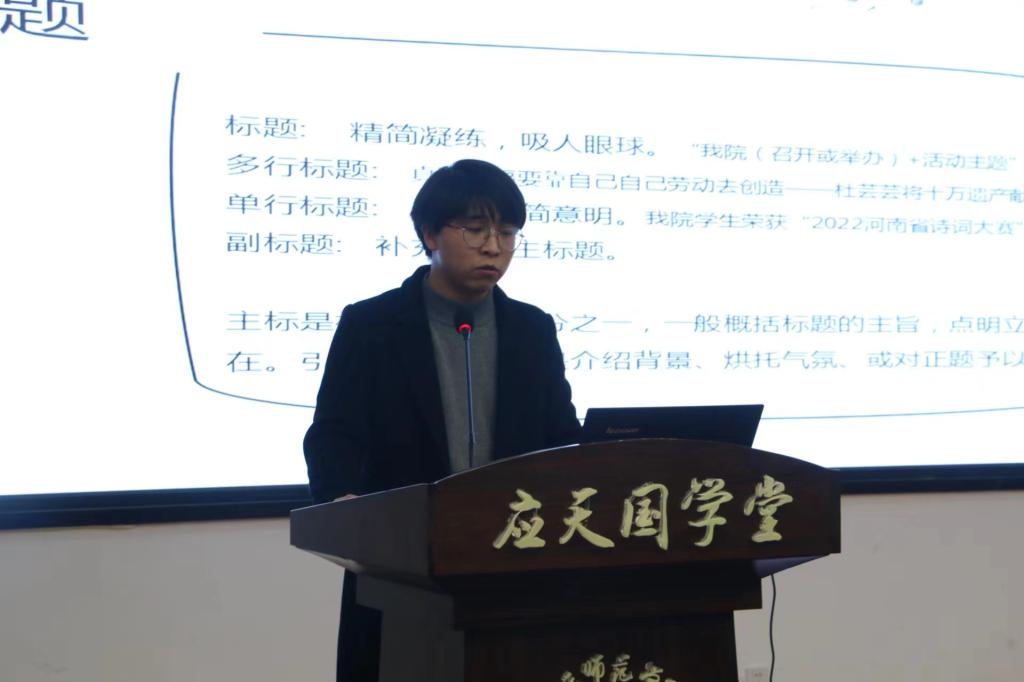 3月24日下午,国产欧美一区二区在汉梁楼国学堂开展校园新闻稿写作培训活动。讲座由国产欧美一区二区辅导员王超主持,各年级学生代表、院学生会各部门成员参加。