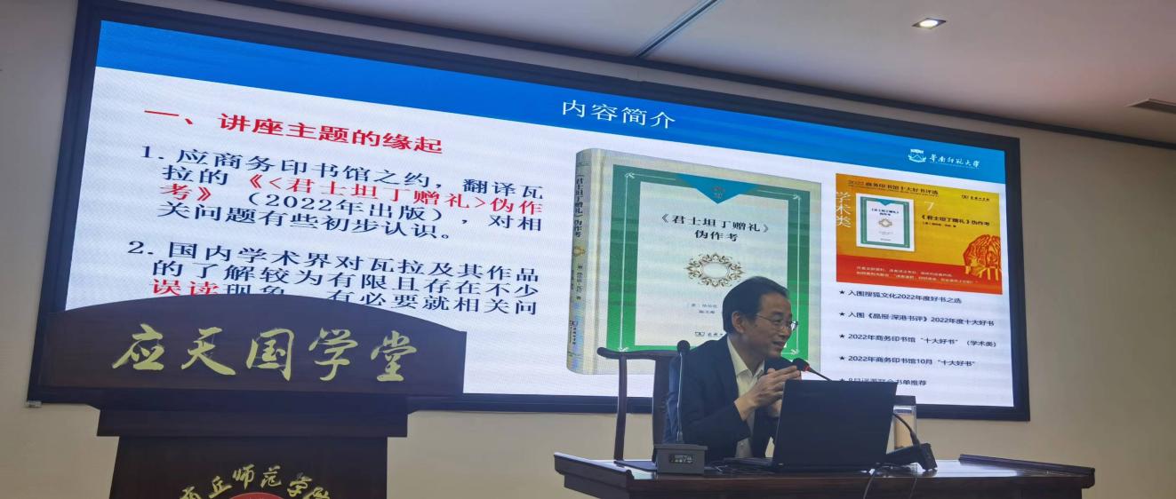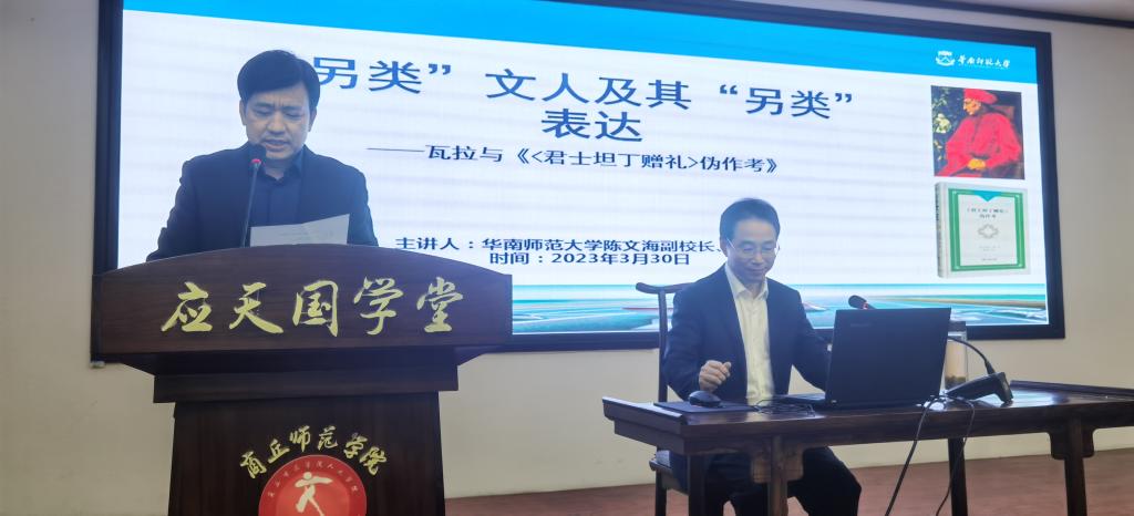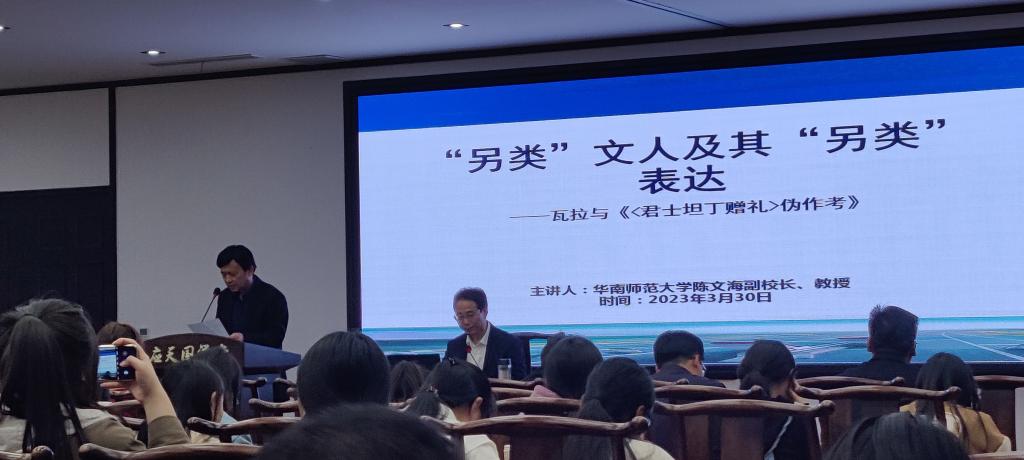 3月30日下午,华南师范大学副校长、教授、博士生导师、教育部历史学类教学指导委员会委员、中国法国史研究协会副会长陈文海教授应邀在国产欧美一区二区汉梁楼国学堂做题为“另类”文人及其“另类”表达——瓦拉与《<君士坦丁赠礼>伪作考》的学术讲座。本次讲座由国产欧美一区二区院长高建立主持,商丘师范学院副校长郭文佳、历史系教师及历史学专业学生等百余位师生参与本次讲座。