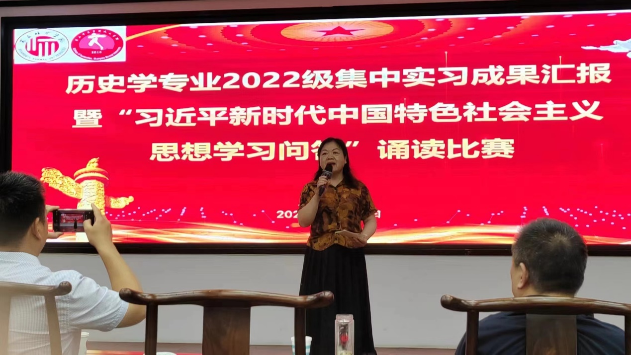 比赛伊始,历史系主任薛立芳对本次实习内容与特点进行介绍。她指出,本次活动以师范教育为底色,以思政教育为引领,将学习习近平新时代中国特色社会主义思想与师范生技能训练相结合,着力培养师范生师德规范、教育情怀,培育社会主义核心价值观,坚定“四个自信”,自觉担起培养民族复兴大任的时代新人的责任与使命,为未来走向教师岗位奠定扎实基础。本次实习临近期末,同学们一边备考,一边积极排练小组诵读作品,展现出历史学专业学生的认真态度和责任担当。