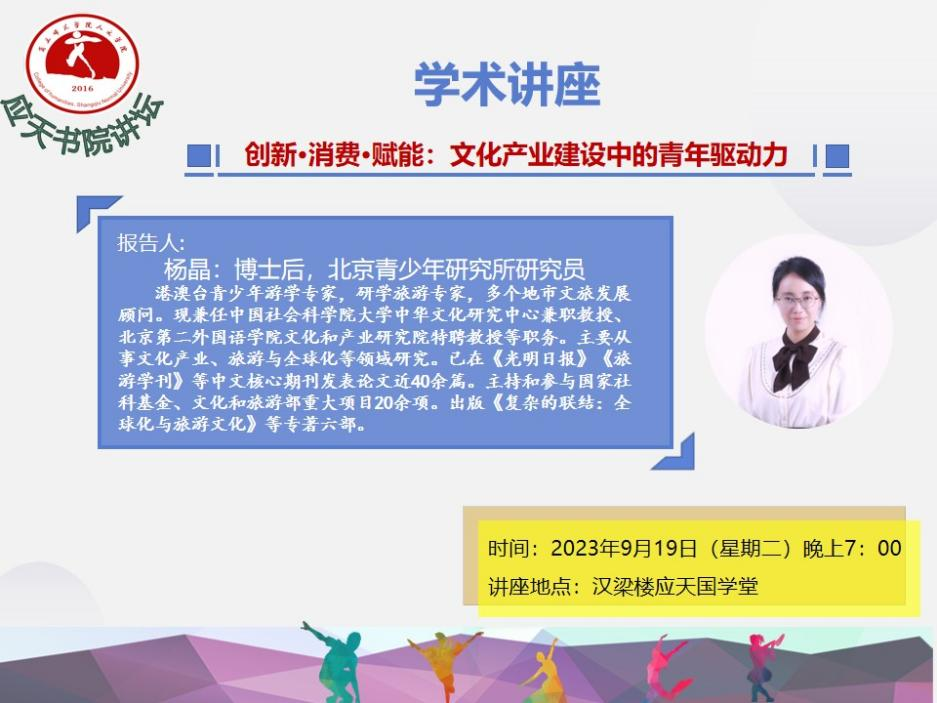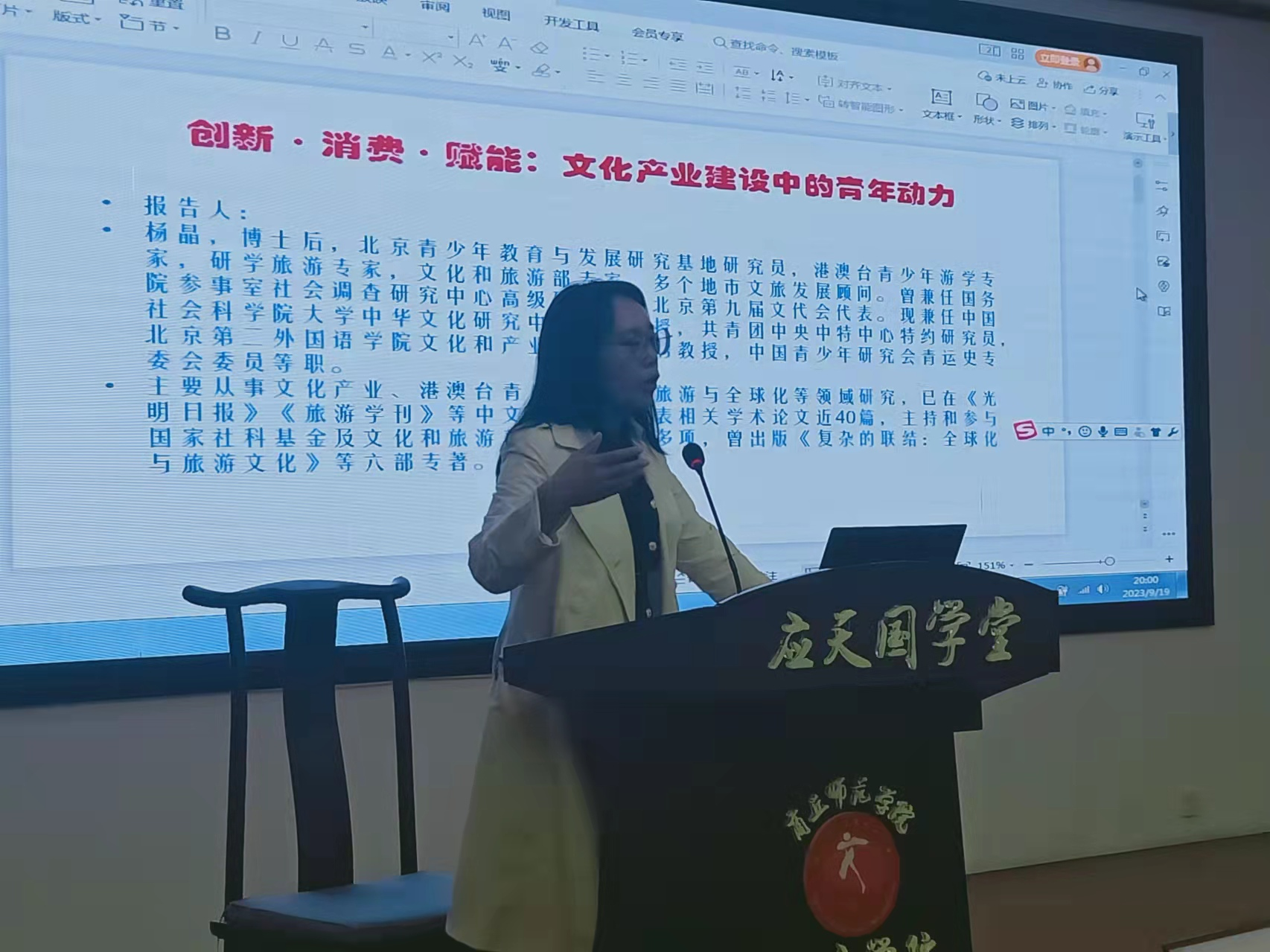 9月19日晚,国产欧美一区二区在汉梁楼国学堂举行了专题学术讲座活动。本次讲座邀请了北京青少年研究所研究员、港澳台青少年游学专家、博士后杨晶教授主讲,讲座题目为“创新 消费 赋能:文化产业建设中的青年动力”。