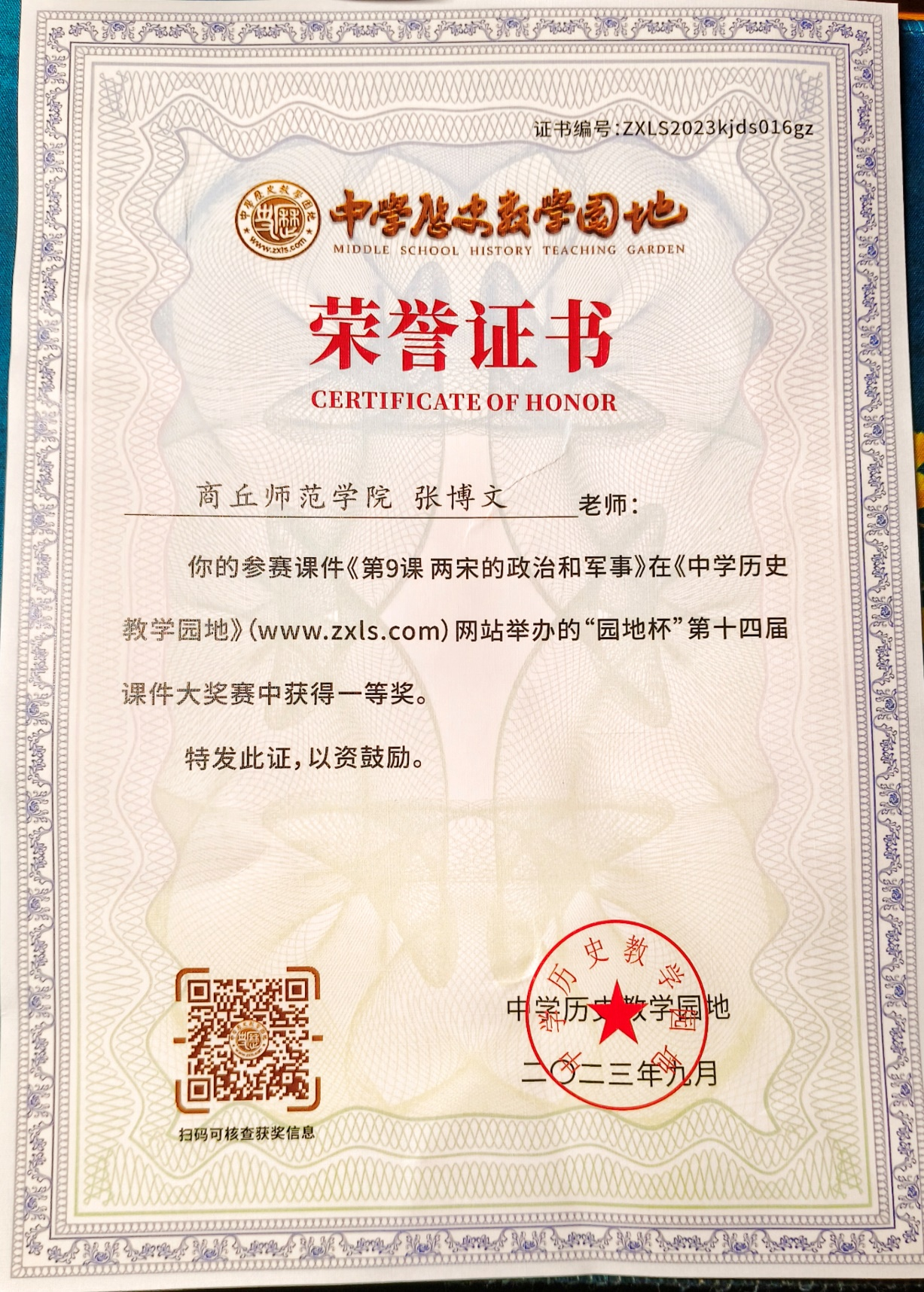 国产欧美一区二区历史学专业2020级师范生张博文制作的课件《第9课 两宋的政治和军事》在《中学历史教学园地》(www.zxls.com)网站举办的“园地杯”第十四届课件大赛中荣获一等奖。