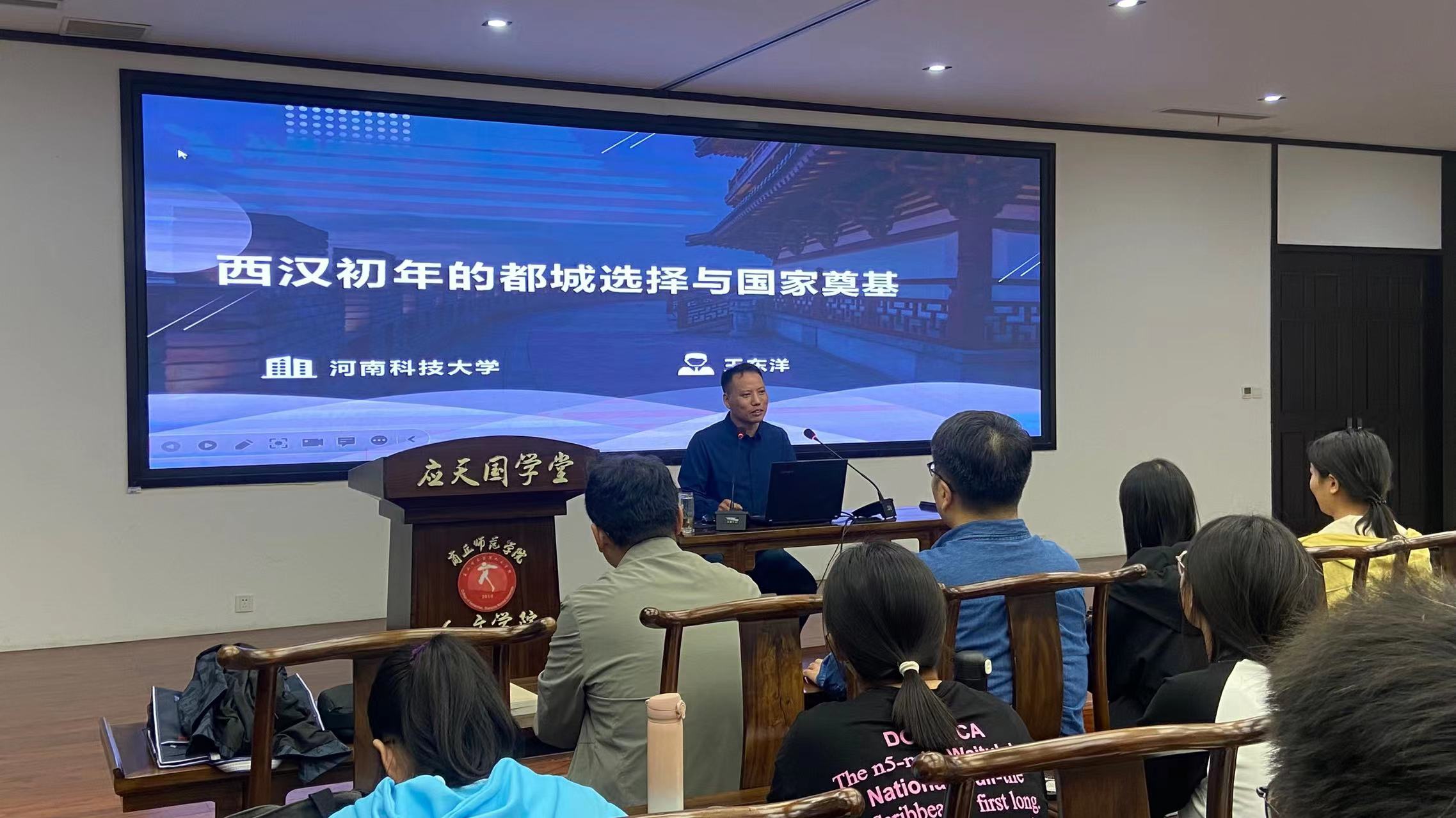 讲座伊始,王东洋教授首先回忆了九十年代后期在商师历史专业求学的美好经历。随后,他围绕“西汉初年的都城选择与国家奠基”这一主题,分别从“刘邦称帝与定都洛阳”、“制度建设与帝国奠基”、“迁都关中之争”、“洛阳都城功能延续”等维度展开,重点讲述了西汉初建都洛阳的历史原因及都洛期间的重要政治举措,考察了其后又“西都关中”的深层次原因。王教授在讲授历史问题时,注意史料解读和文本分析,通过对史料抽丝剥茧的分析,还原西汉初都城选择背后的诸多历史真相。他认为西汉定都洛阳的时间虽然只有短短三四个月,但是却做了系统的制度建设,为大汉帝国数百年的基业奠定雄厚根基,可谓影响深远。