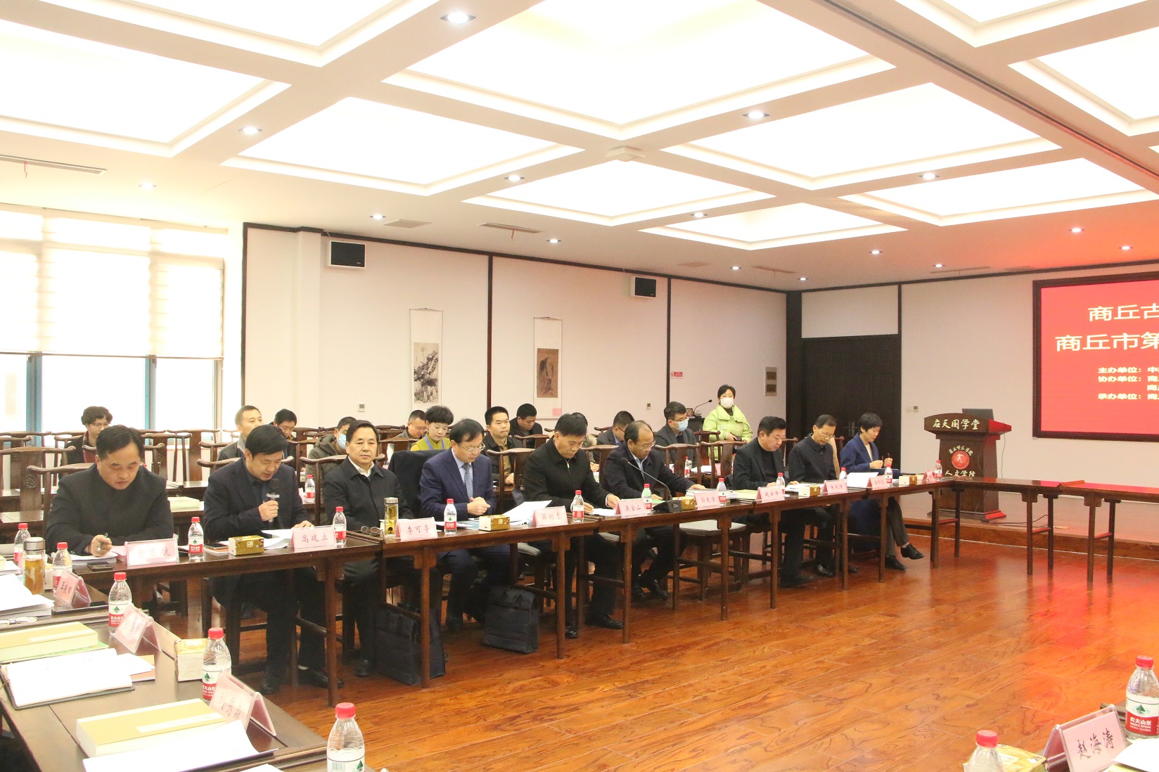 本次活动由中共商丘市委宣传部、商丘师范学院、商丘市文学艺术界联合会主办,商丘日报社、商丘市文化旅游投资集团有限公司、商丘市历史文化名城保护委员会办公室、商丘市古城保护开发建设有限公司协办,商丘师范学院国产欧美一区二区、商丘市民间文艺家协会承办。商丘职业技术学院党委书记、校长薛明志、商丘市委宣传部副部长刘道明、商丘市人民政府副秘书长胡学恩、商丘市文化广电和旅游局局长史新艳、商丘日报社总编辑宋圣英、商丘市文化旅游投资集团有限公司董事长陈星、睢阳区委常委、宣传部部长、区政府副区长黄英杰、商丘市文联副主席曹思航、商丘市运输事业发展中心党委书记沈祥山、商丘市历史文化名城传承保护中心副主任赵耀、商丘市古城保护开发建设有限公司董事长周文和、商丘市民协主席张学勇、商丘市殷商文化研究会副会长王良田、商丘市国学文化促进会会长李可亭、商丘师范学院图书馆馆长朱凤祥、商丘职业技术学院经济管理学院院长王海英等40余名领导、专家学者应邀参加了会议。我校党委副书记吴金山、副校长郭文佳出席活动。