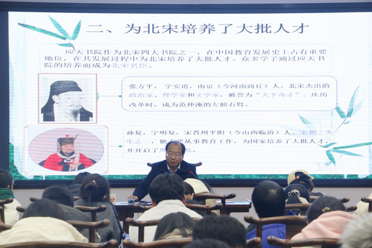 随后,郭文佳教授围绕着“应天书院的建立和发展”、“为北宋培养了大批人才”、“开启北宋理学思潮,奠定宋代学术基础”、“传承应天书院精神,弘扬优秀传统文化”等维度展开。讲座开篇从杨悫、戚同文等历史上著名的大家对应天书院的建立和发展展开讲述,同时还探讨了“为何应天书院被称为四大书院之首”。郭文佳教授还重点介绍了“范仲淹与应天书院相互成就的佳话”,他积极提倡复兴儒学,兴学育才,开启了北宋理学的思潮、奠定了宋代学术的基础。